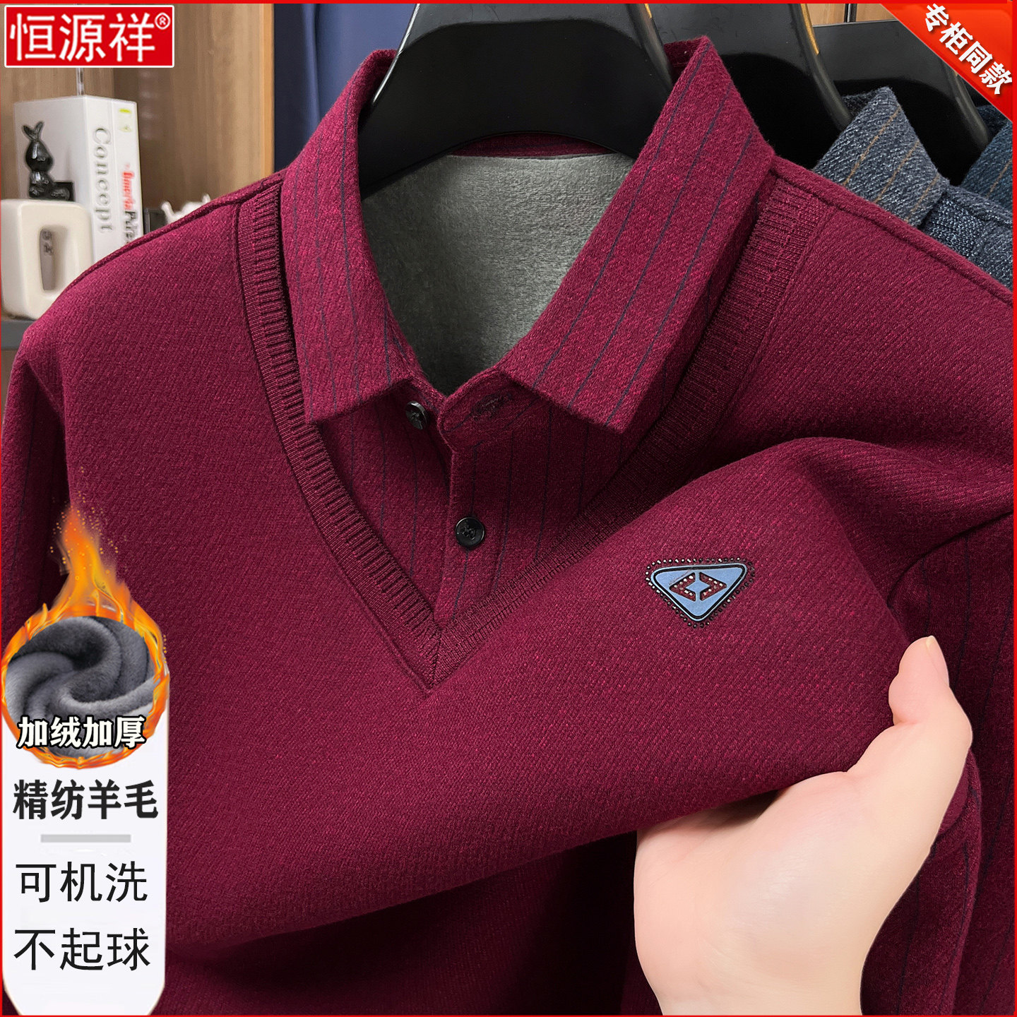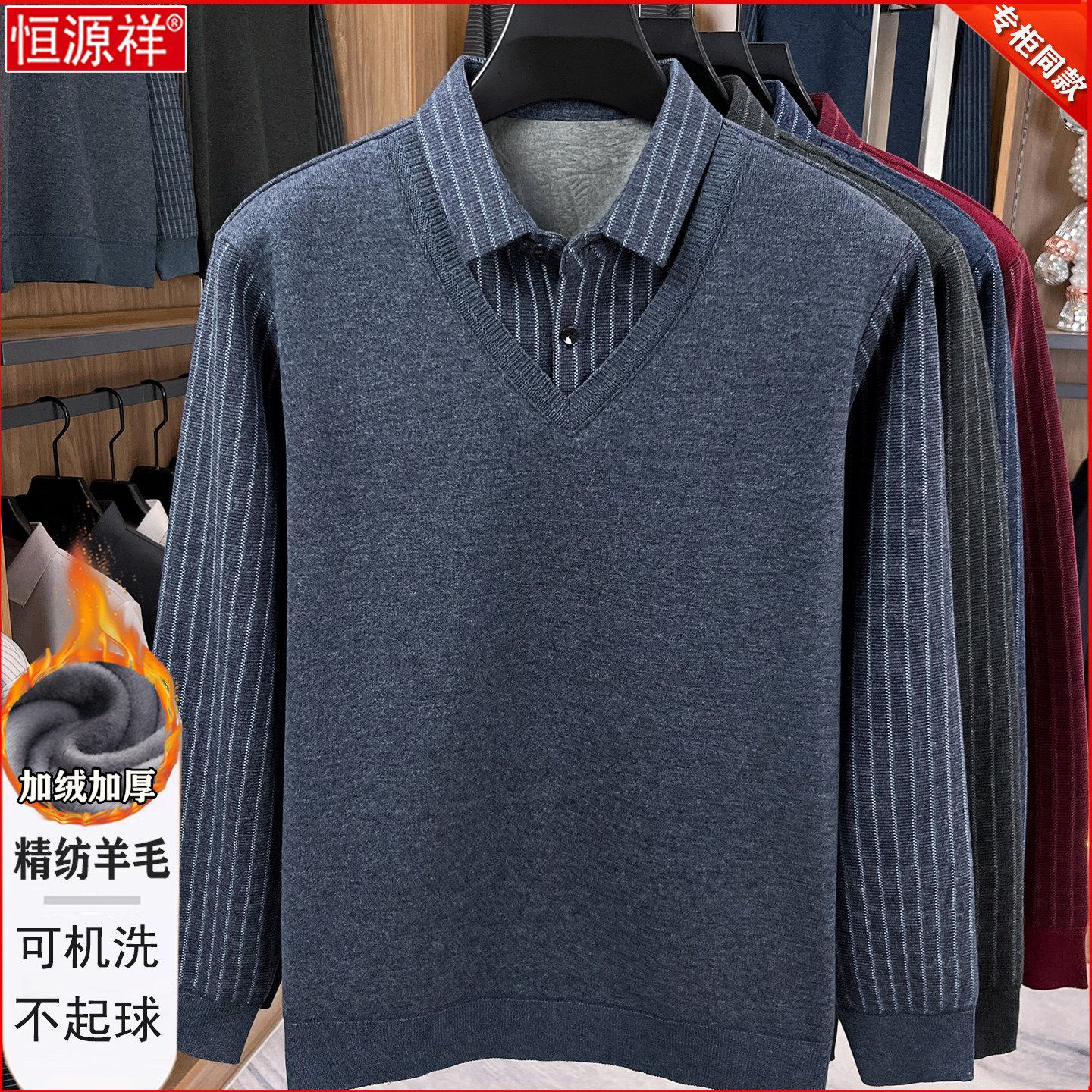 恒源祥100%羊毛衫男2025新款冬季中老年加绒加厚假两件爸爸装毛衣