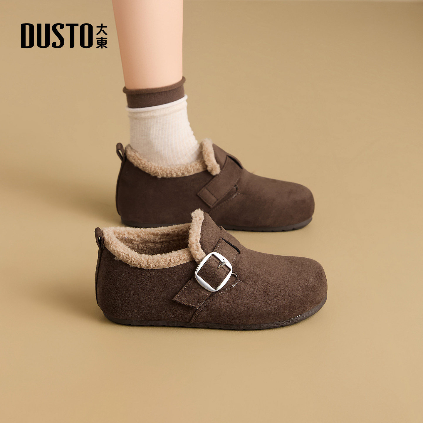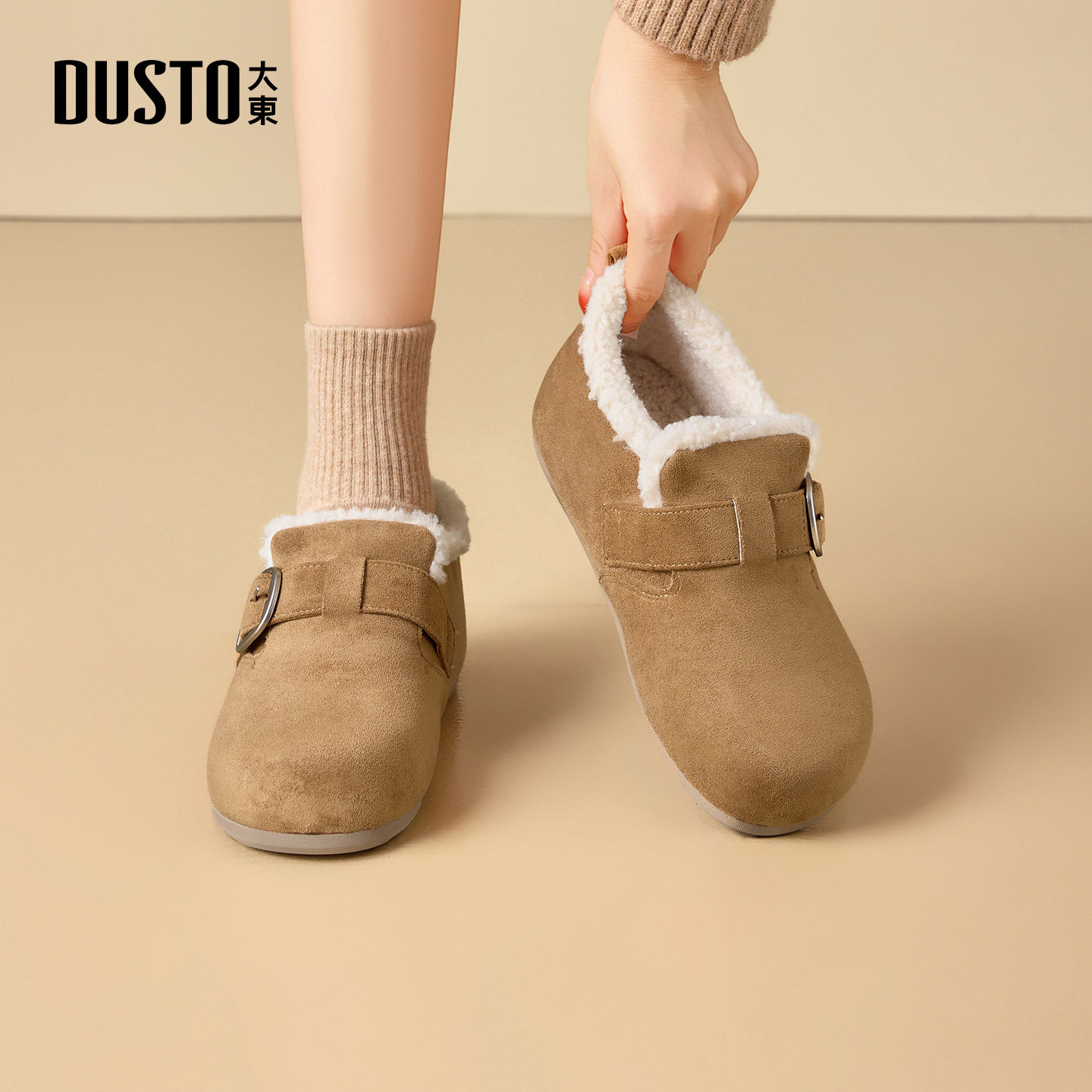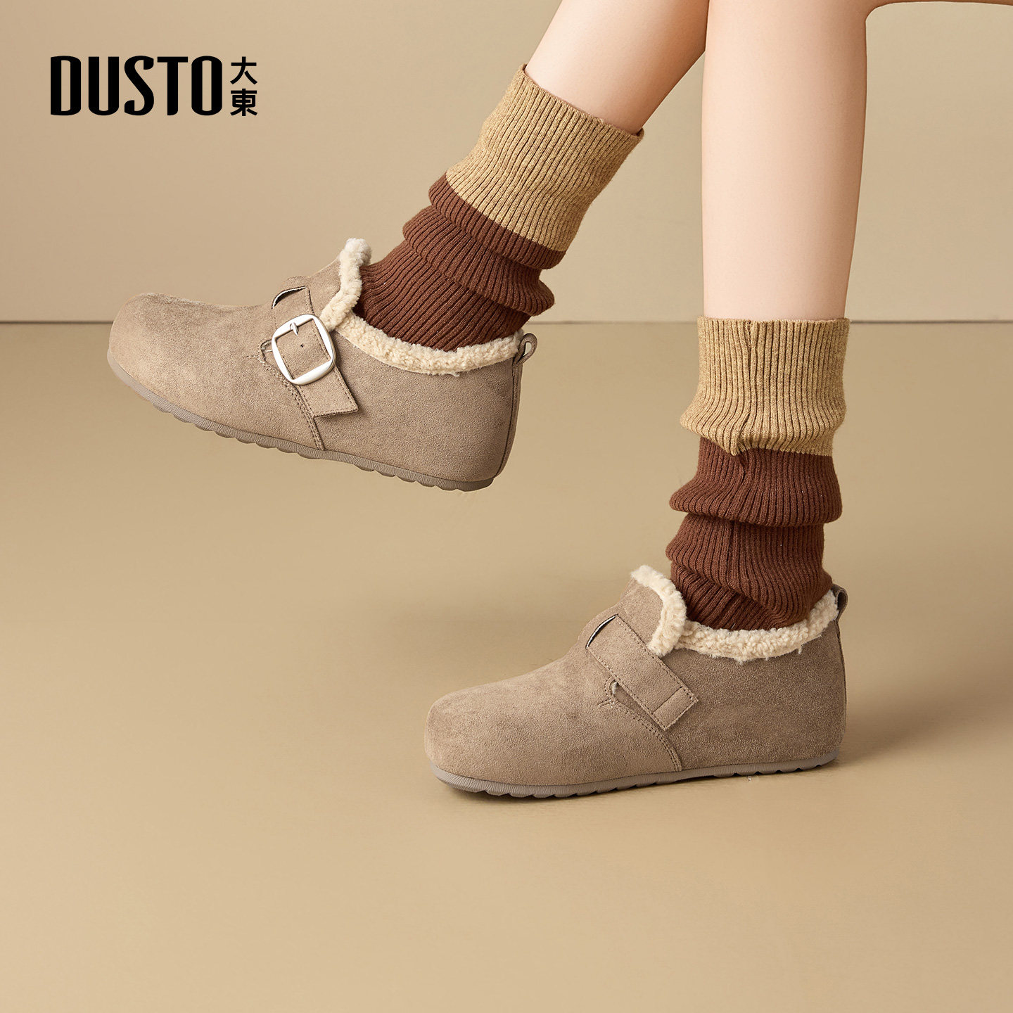 大东女鞋勃肯鞋2025冬季新款加绒雪地靴女靴平底棉靴毛毛博肯短靴