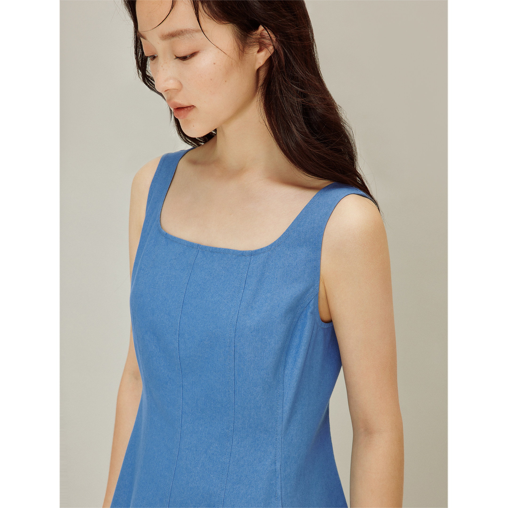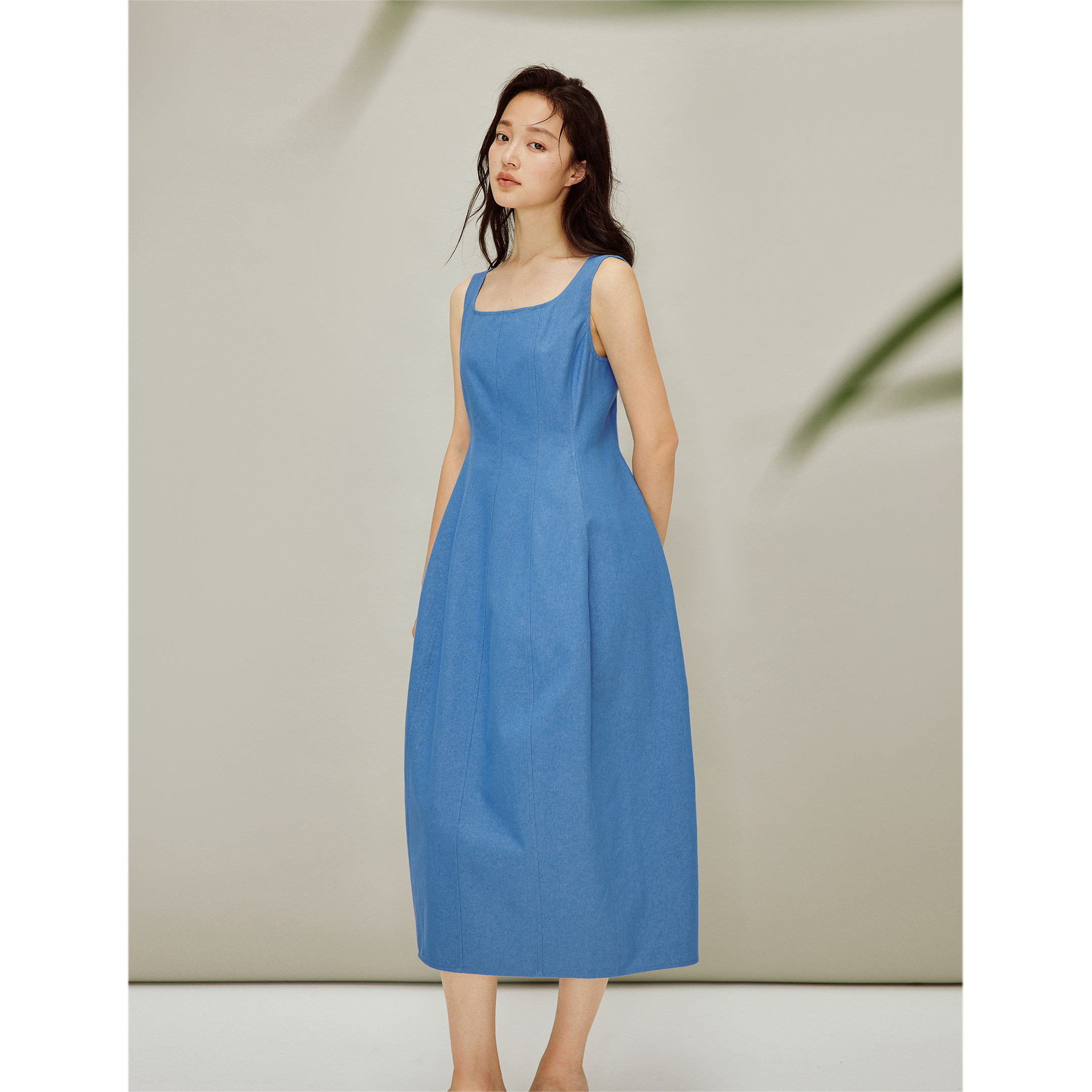 茵曼复古蓝色方领收腰牛仔背心连衣裙2026春季女装新款宽松大摆裙
