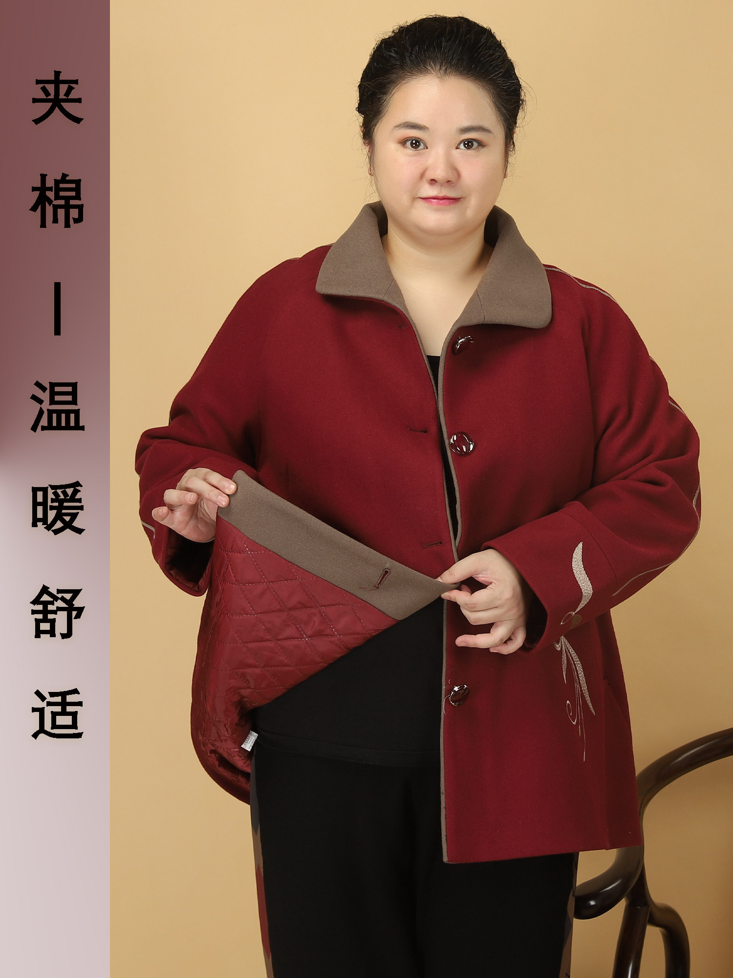 气质夹棉毛呢大衣中老年遮肉外套