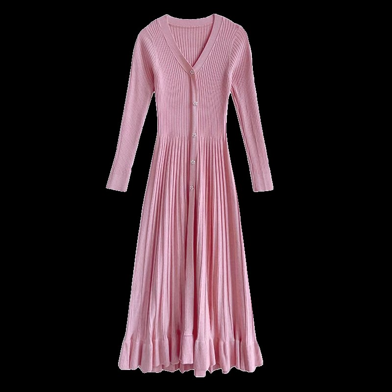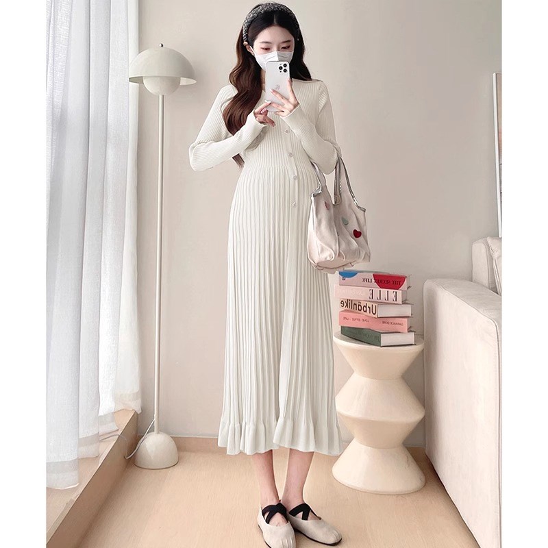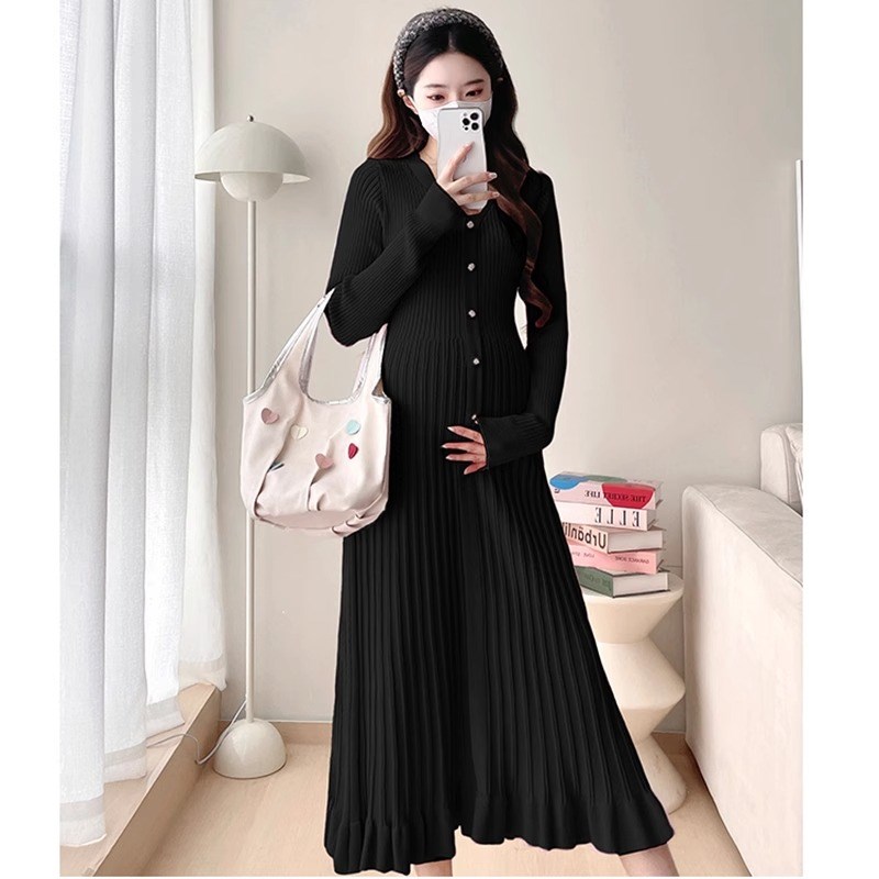孕妇连衣裙秋e冬2025新款法式甜美v领修身长袖百褶中长款针织毛衣