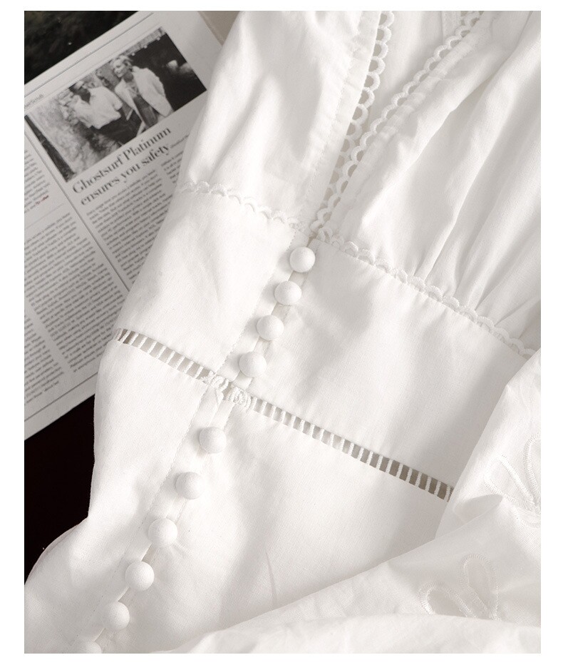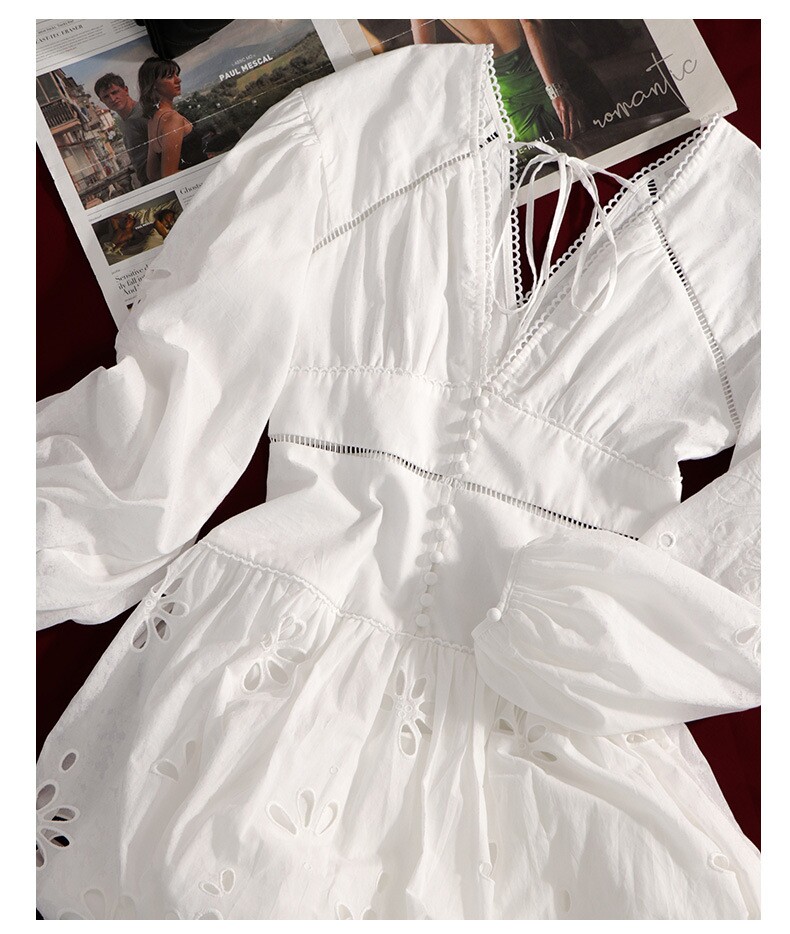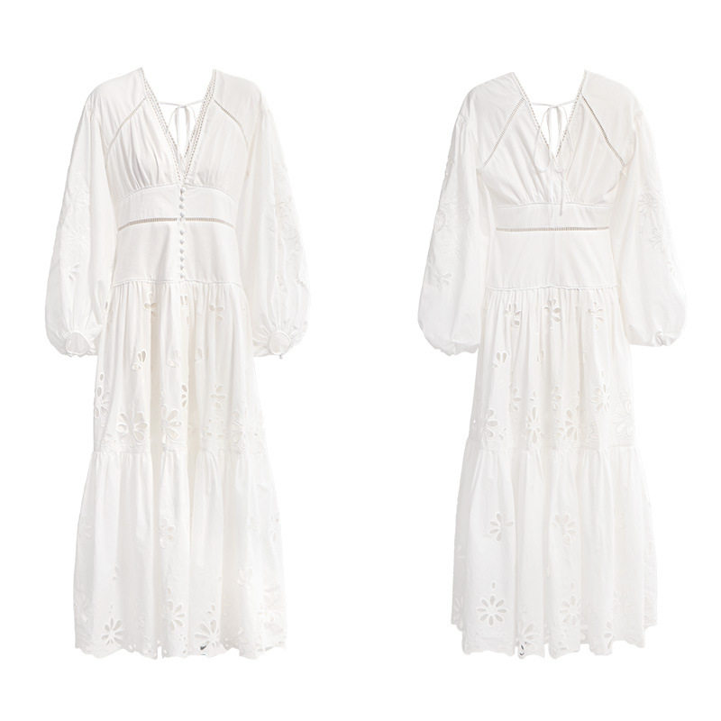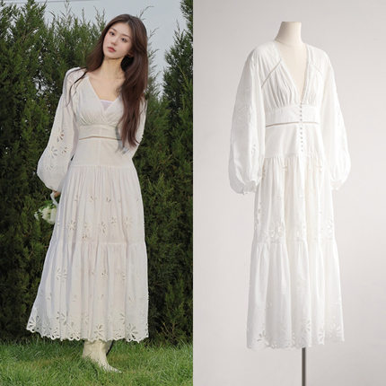 田曦薇同款法式小众2025春夏新款白色镂空刺绣灯笼袖修身连衣裙