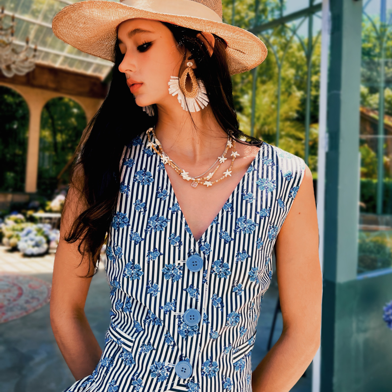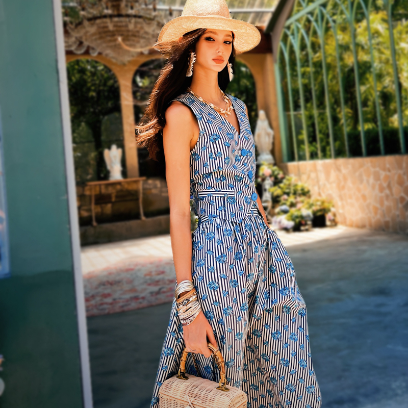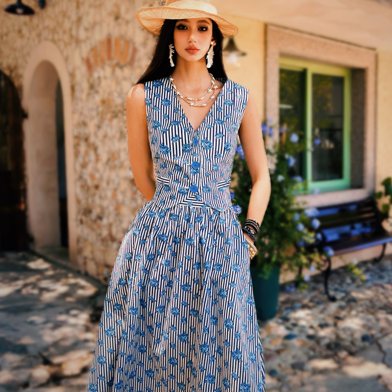 粉红大布娃娃高级感玫瑰印花条纹马甲半身长裙女士夏套装2025新款