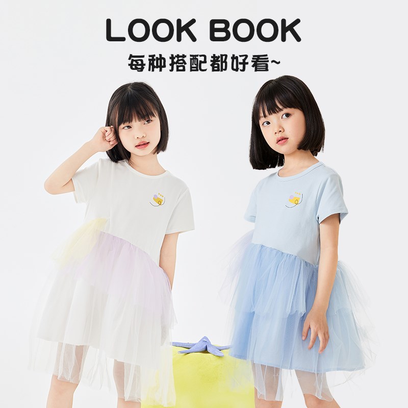 加比瑞童装女童连衣裙女孩洋气网纱拼接公主裙甜美短袖T恤裙子