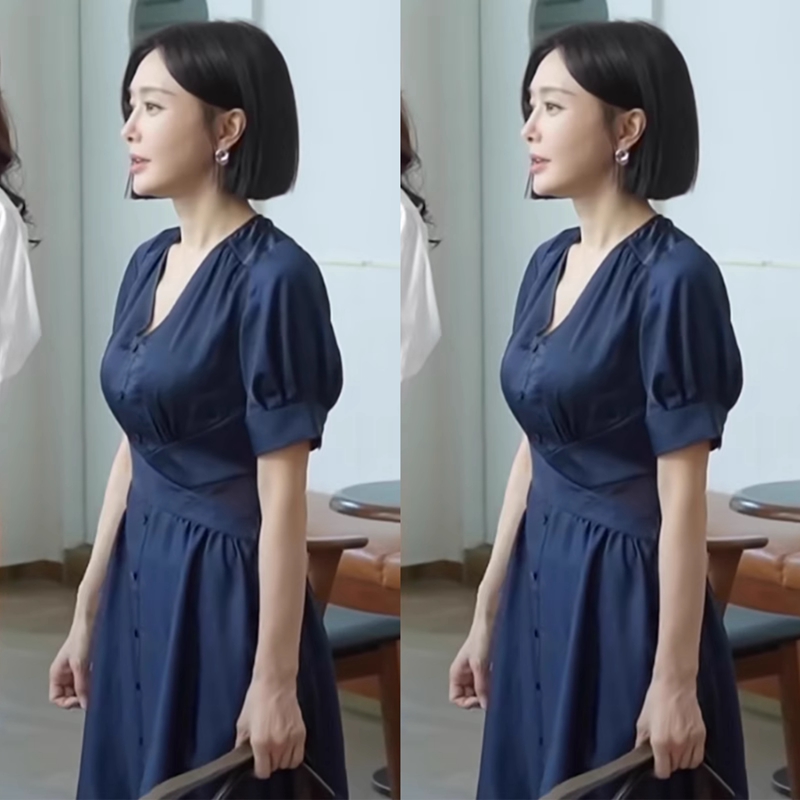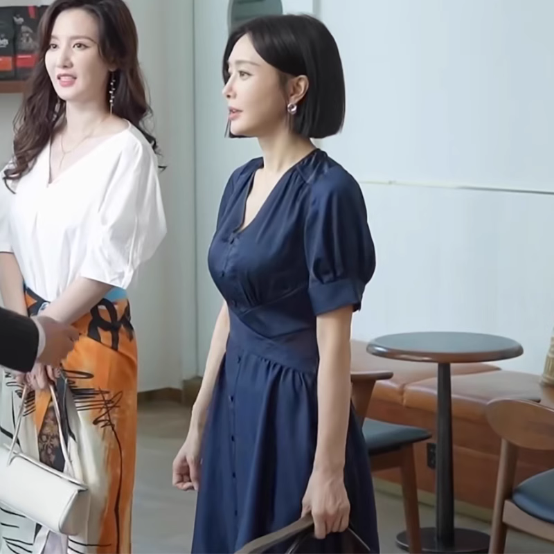 欧代管文闪耀的她秦岚同款蓝色v领泡泡袖连衣裙夏季气质收腰裙子