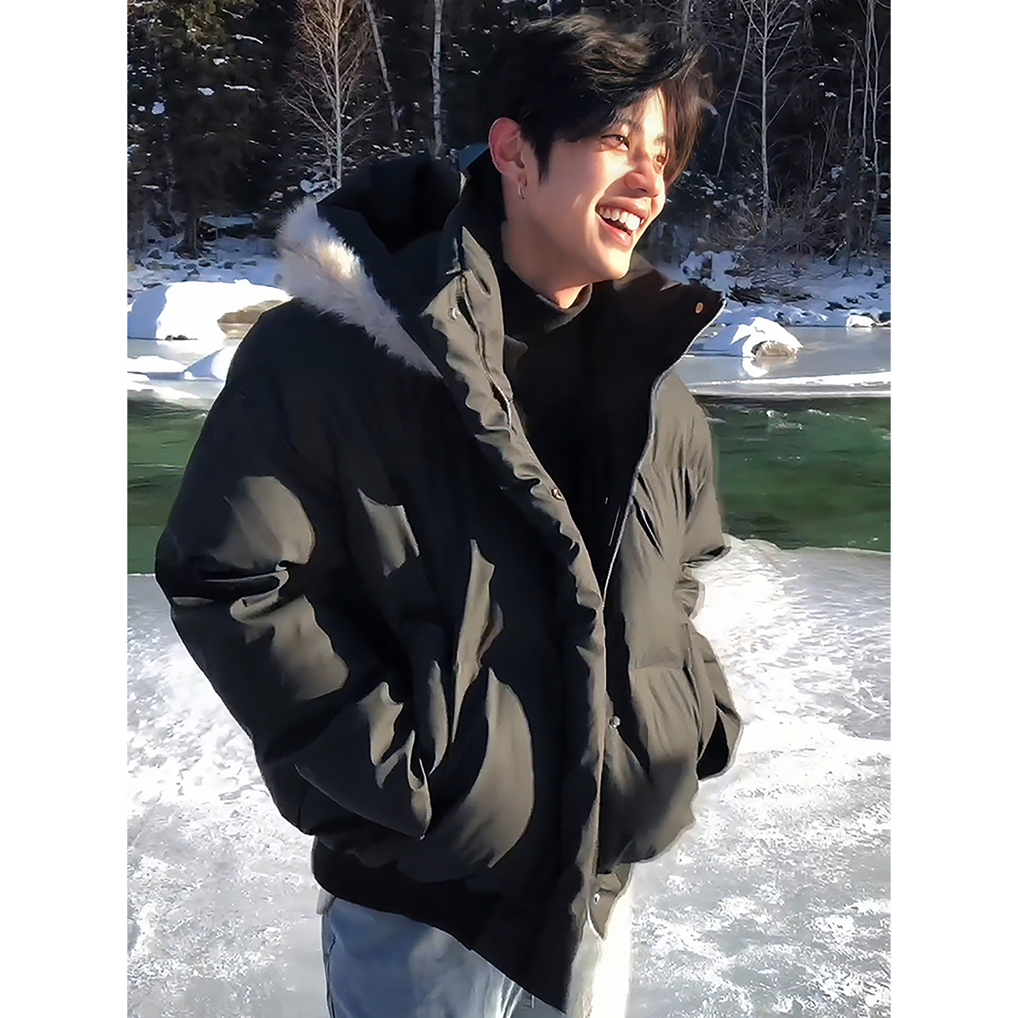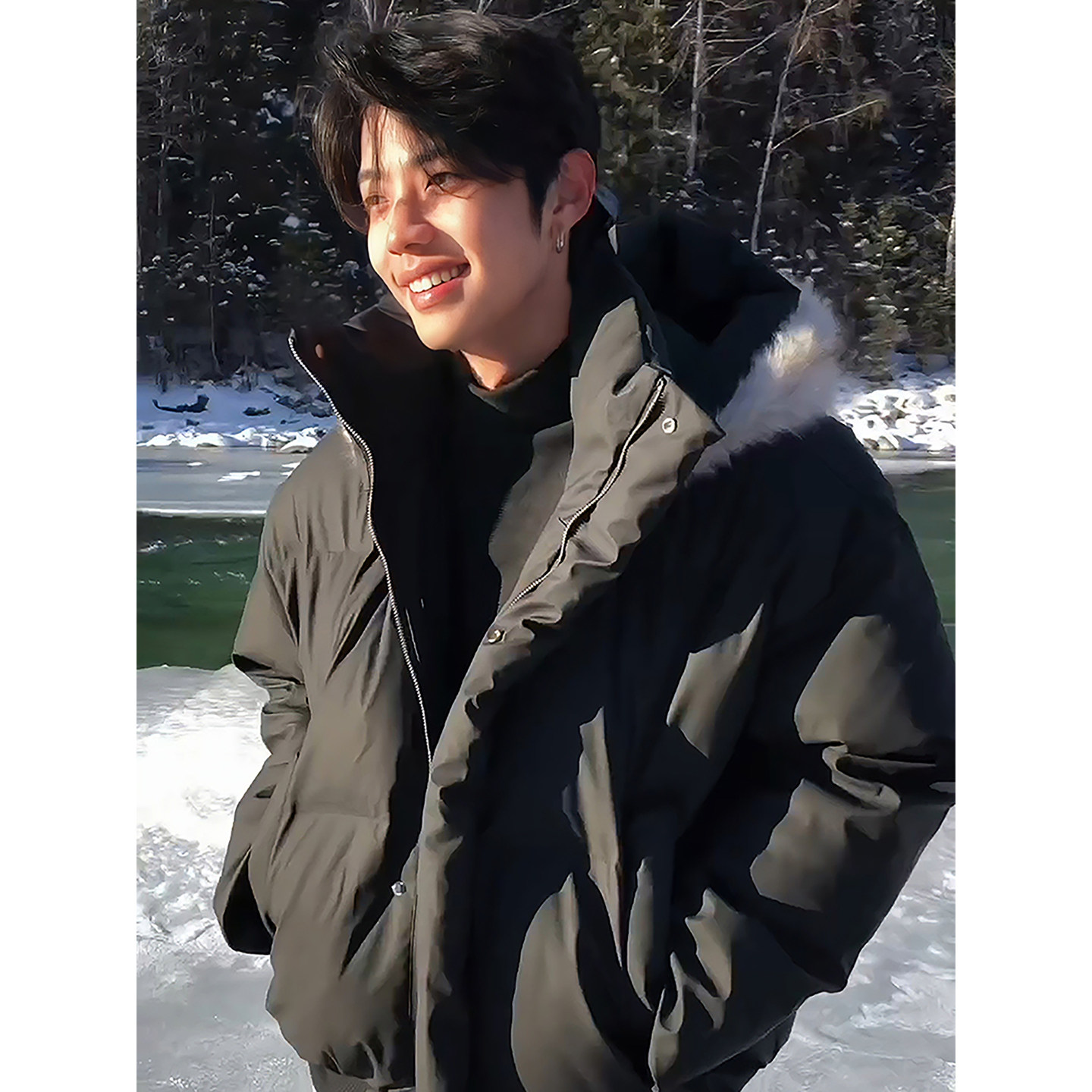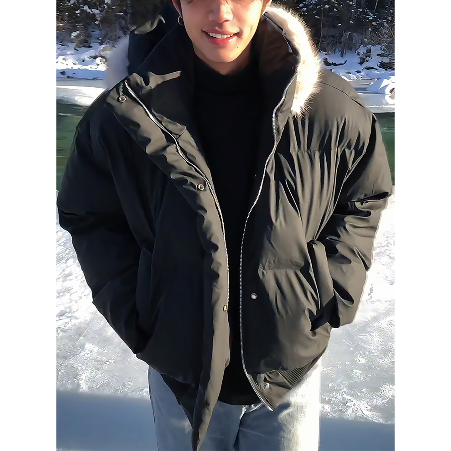 美式pu皮短款羽绒棉服男款冬季加厚大毛领连帽棉服高领廓形面包服