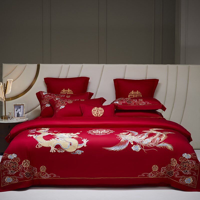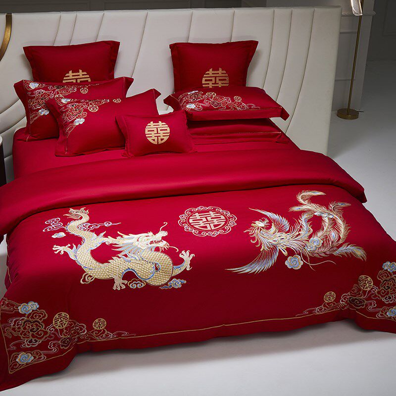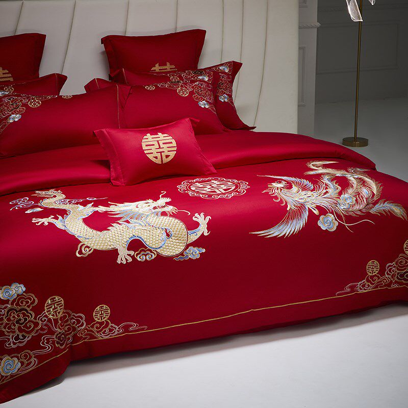 高端龙凤婚庆四件套100S长绒棉纯D棉被套红色结婚喜被床单床上用