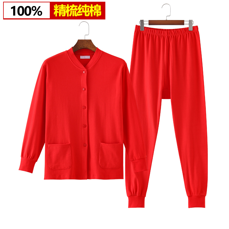 本命年大红色纯棉开衫秋衣秋裤中老年人妈妈鸿运内衣套装全棉宽松