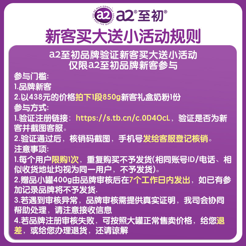 【需注册新客,单拍仅享850g】a2至初1段婴儿配方奶粉850g0-6个月