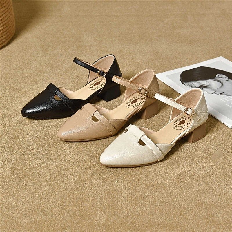 6107夏季新款女士凉鞋单鞋透气软底粗跟尖头中跟百搭时尚单鞋皮鞋