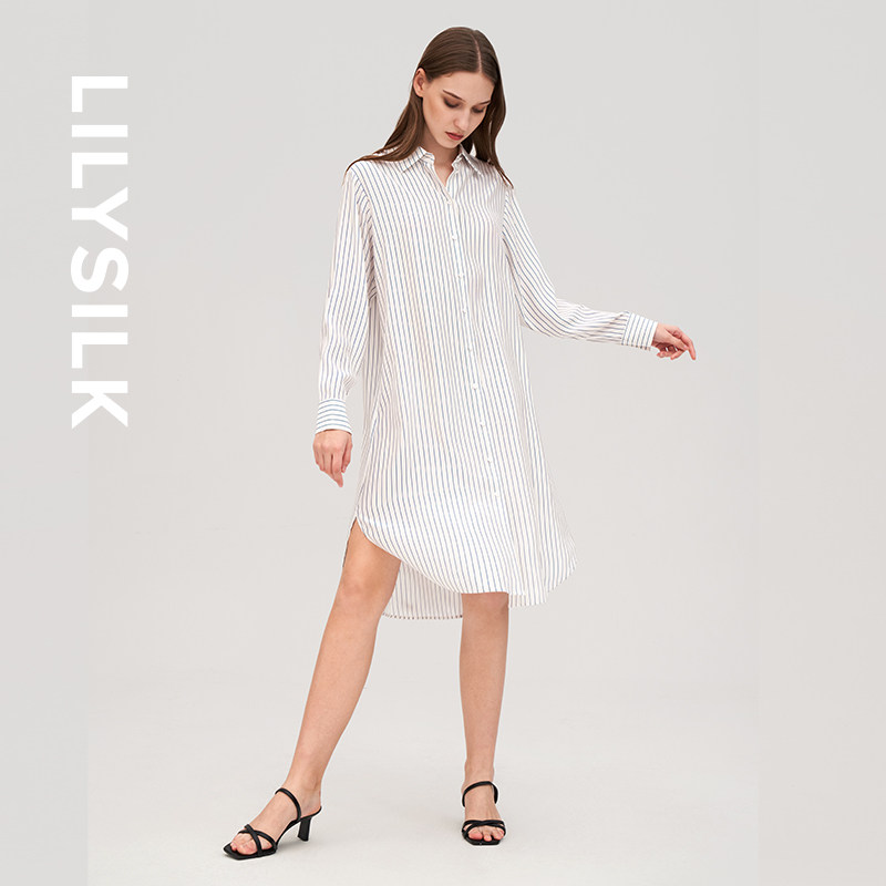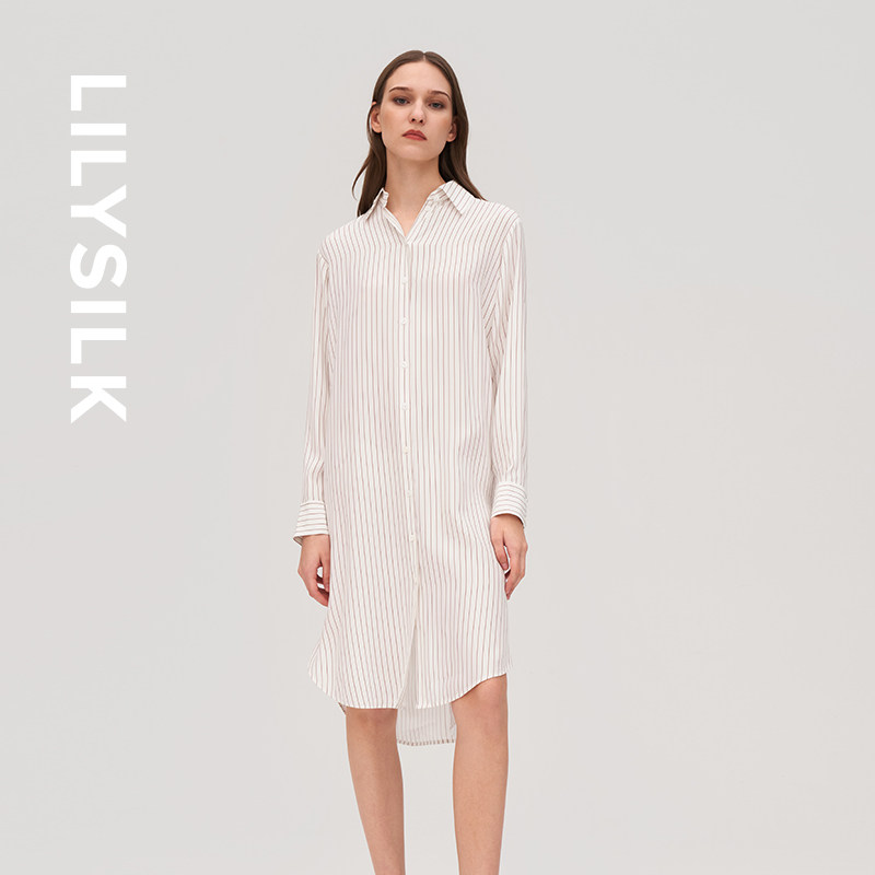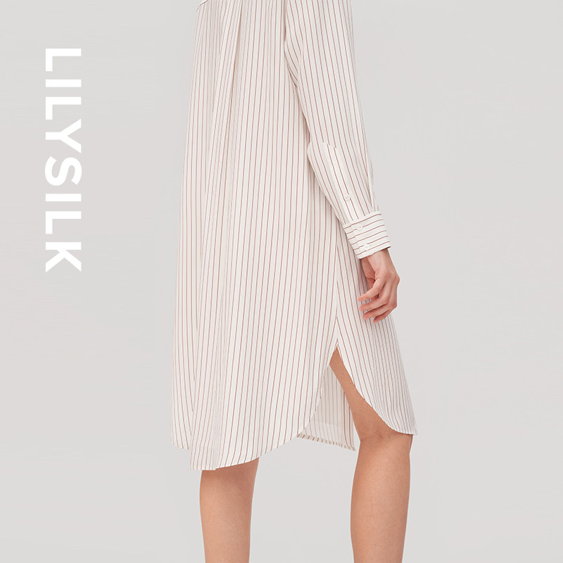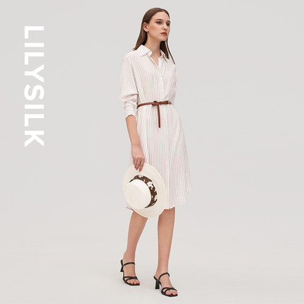 LILYSILK莉莉秀客女士真丝衬衫裙舒适长袖收腰条纹连衣裙