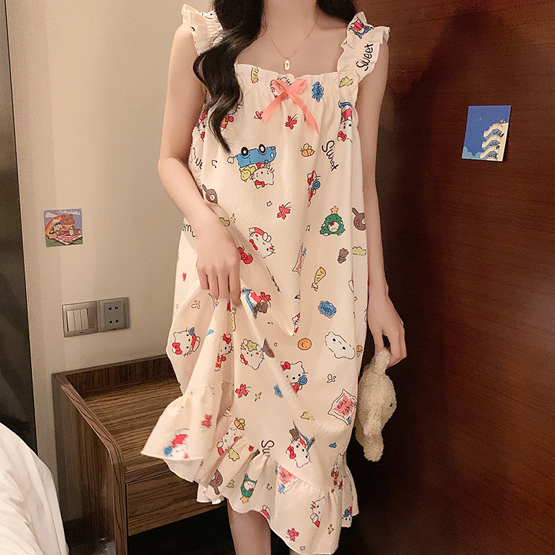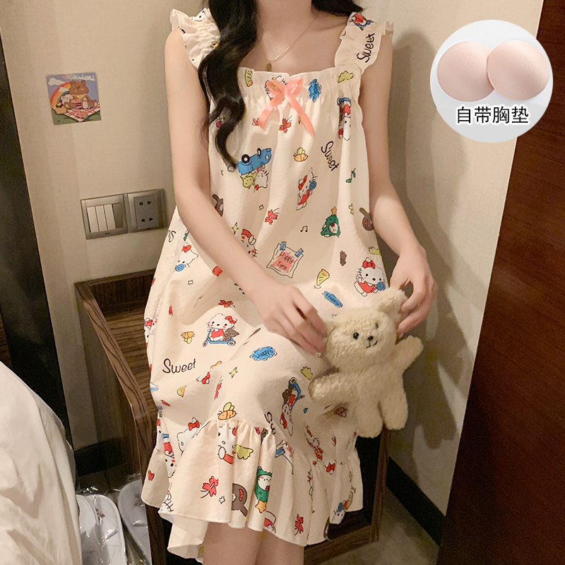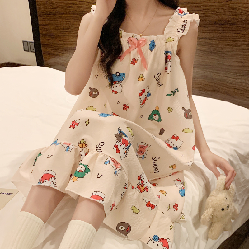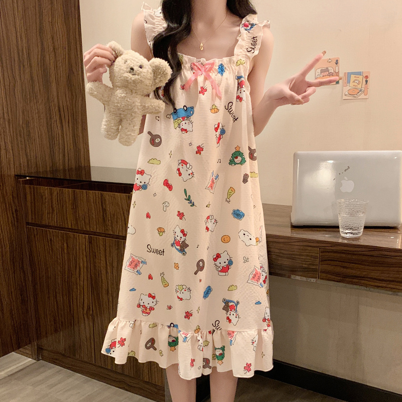 吊带睡裙带胸垫卡通KT猫夏季睡衣女2025新款梭织棉甜美夏天家居服