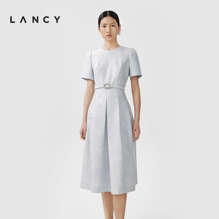 LANCY/朗姿2024春季新款高级感印花连衣裙短袖收腰简约真丝裙子女