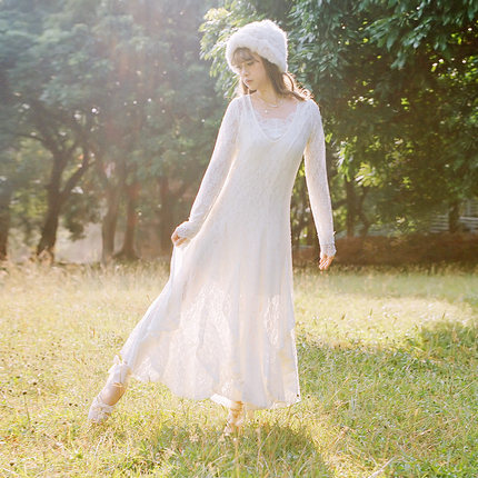 云分子原创春秋冬季V领长袖蕾丝显瘦超重工螺旋下摆气质连衣裙
