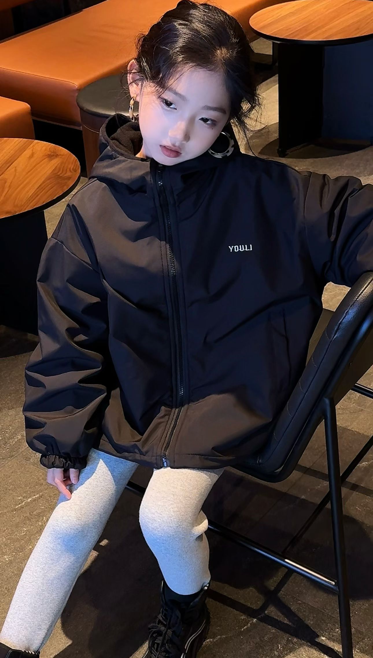 女童两面穿加绒外套2025秋冬新款男童连帽冲锋衣中大童休闲上衣