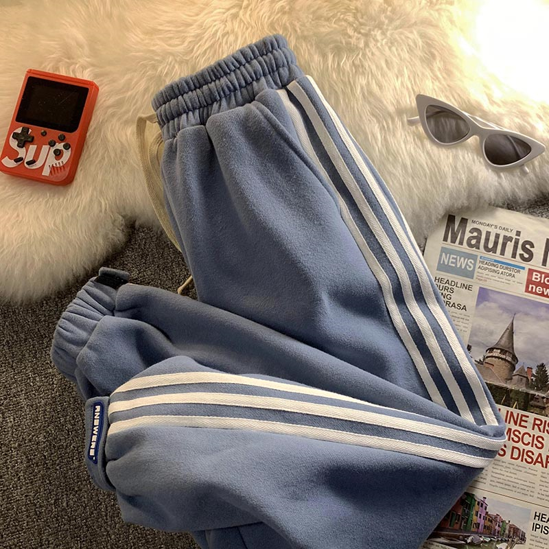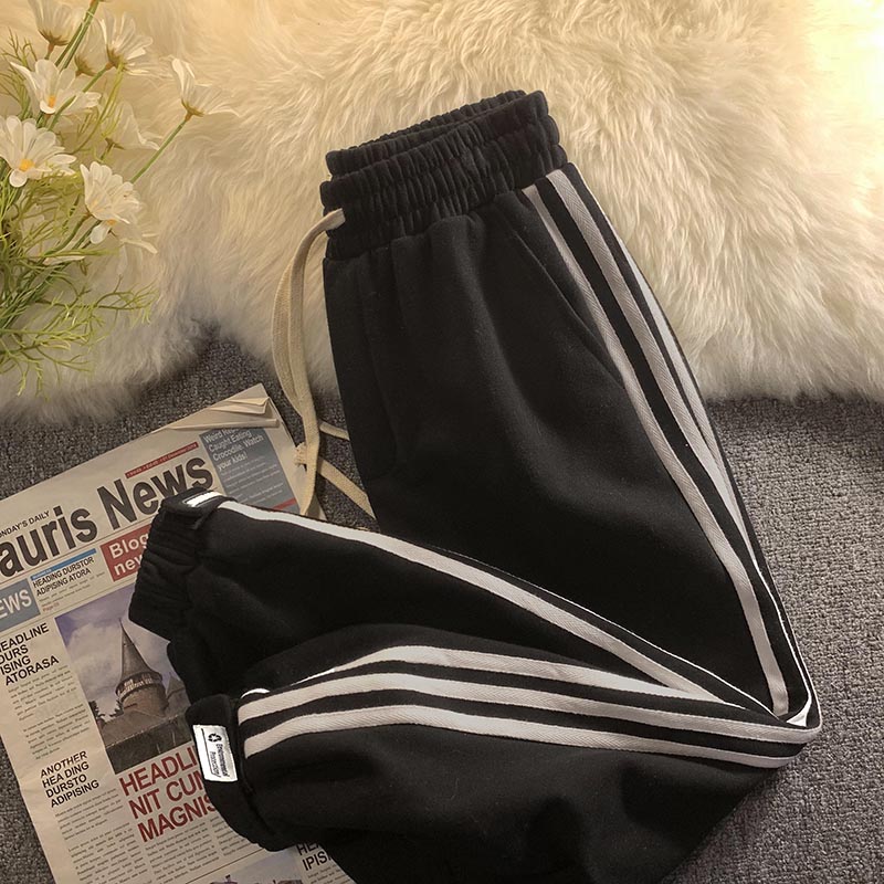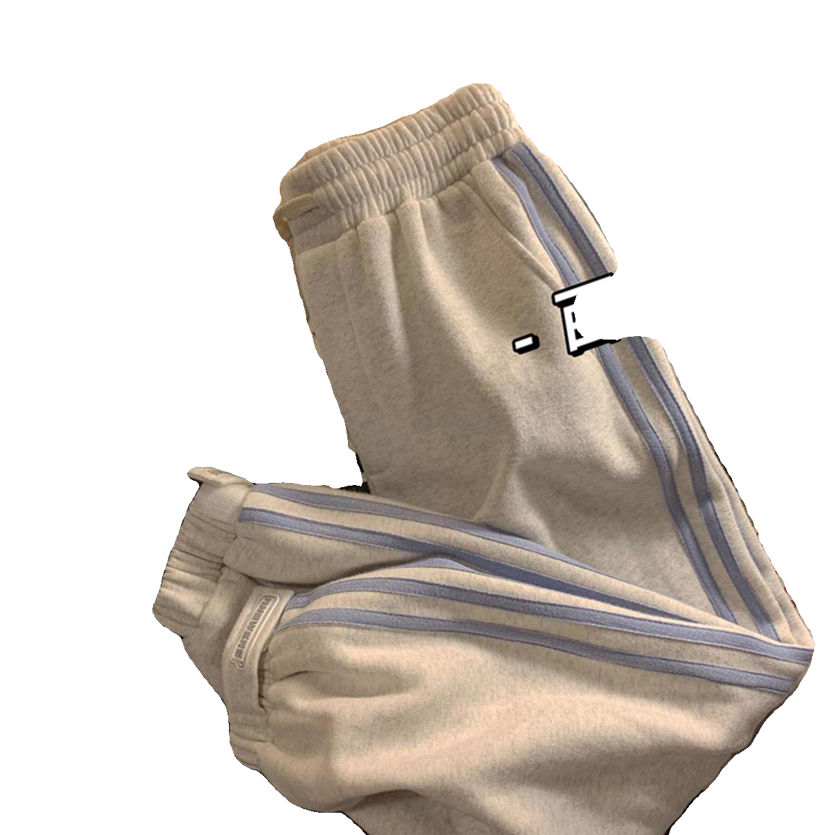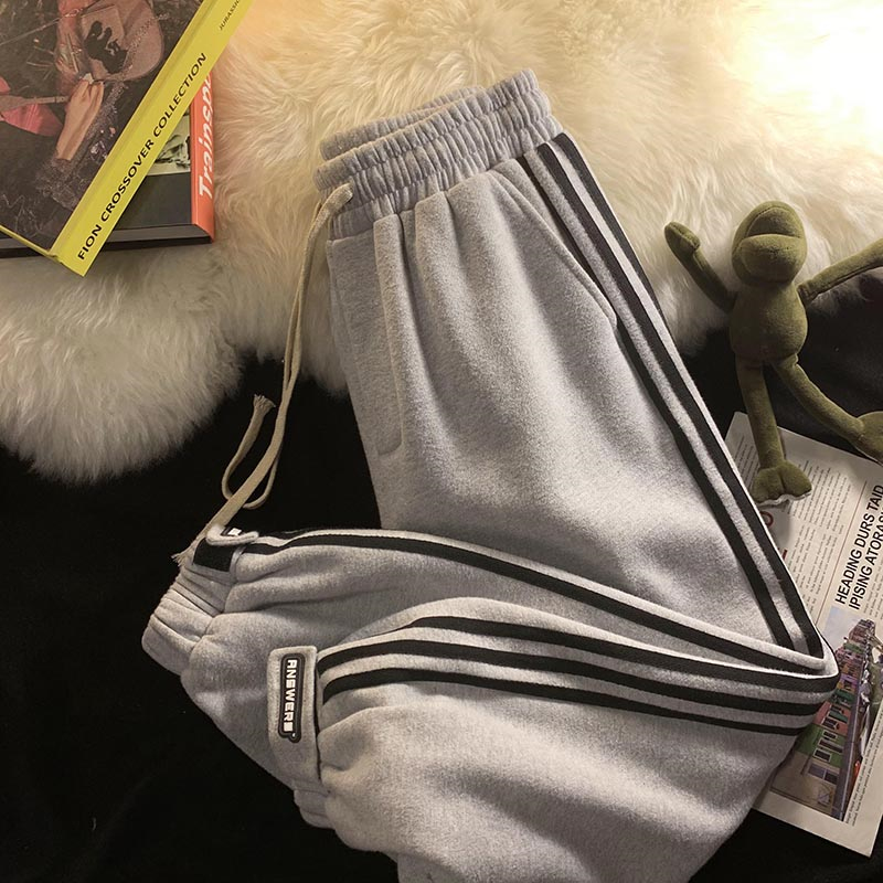 灰色条纹运动裤女新款束脚卫裤秋冬加绒裤子宽松直筒阔腿裤休闲长