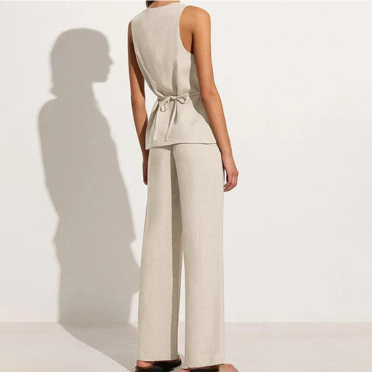 热销棉麻套装女通勤风无袖方领系带背心马甲高腰阔腿裤两件套