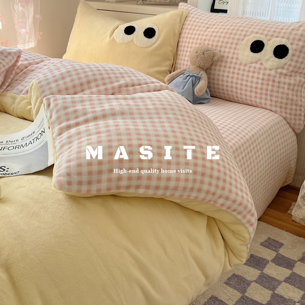 萌趣ins风毛巾绣牛奶绒四件套1.5m1.8法兰绒床单被套冬季加绒加厚