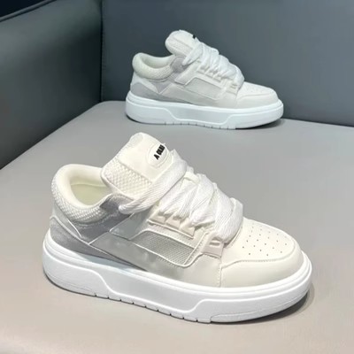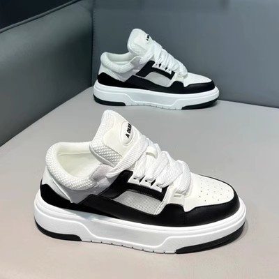 男鞋2023新款透气圆头板鞋潮流百搭小白鞋厚底增高运动休闲面包鞋