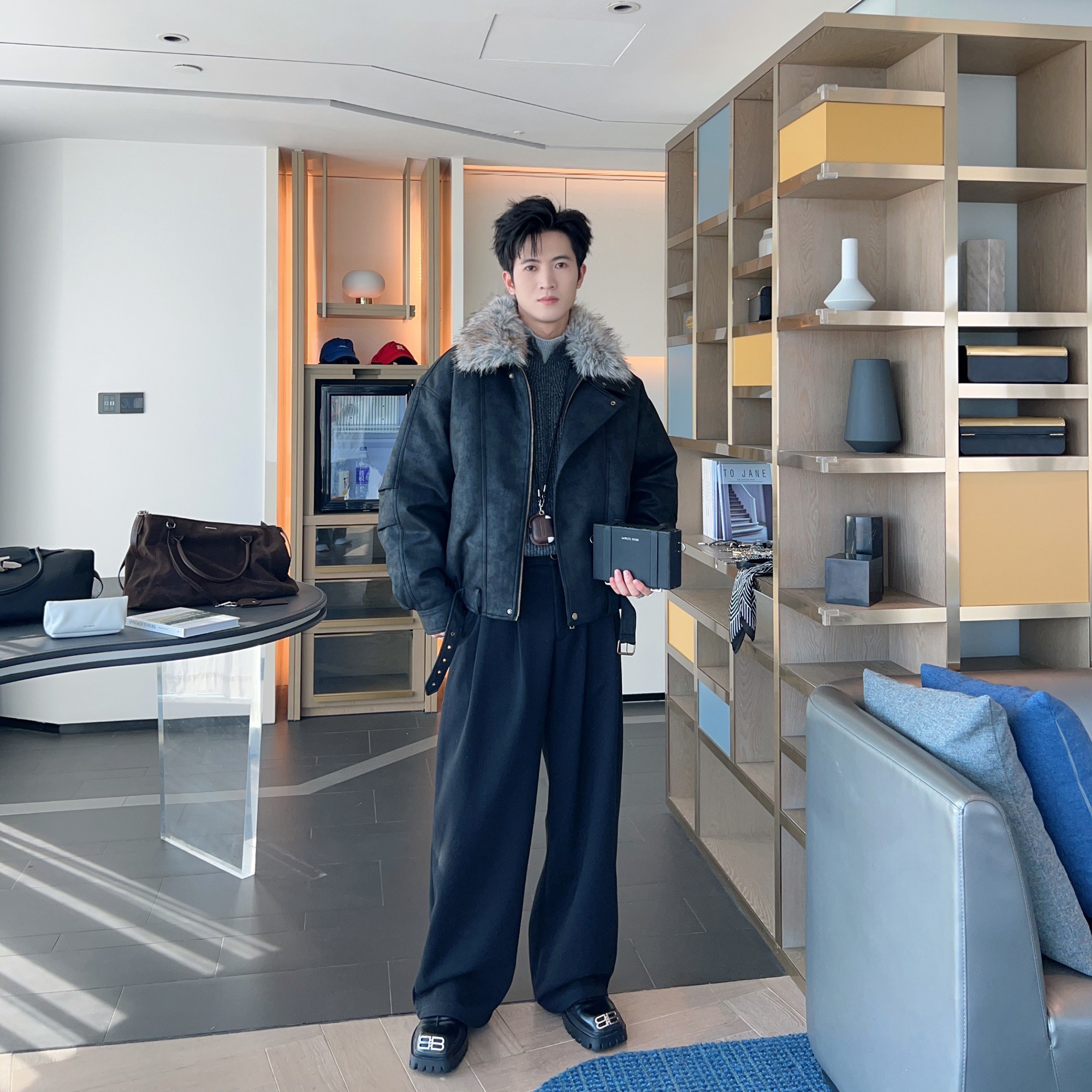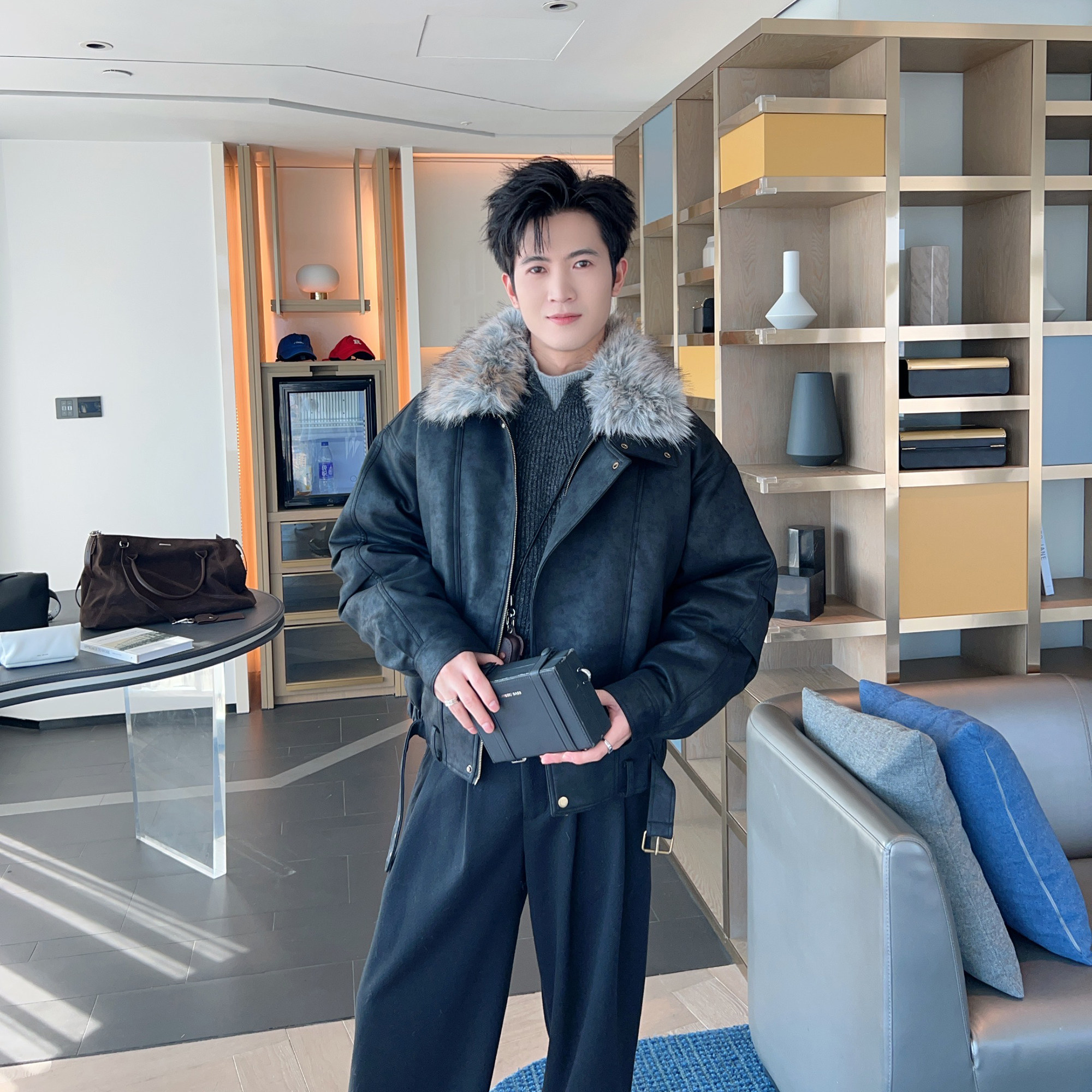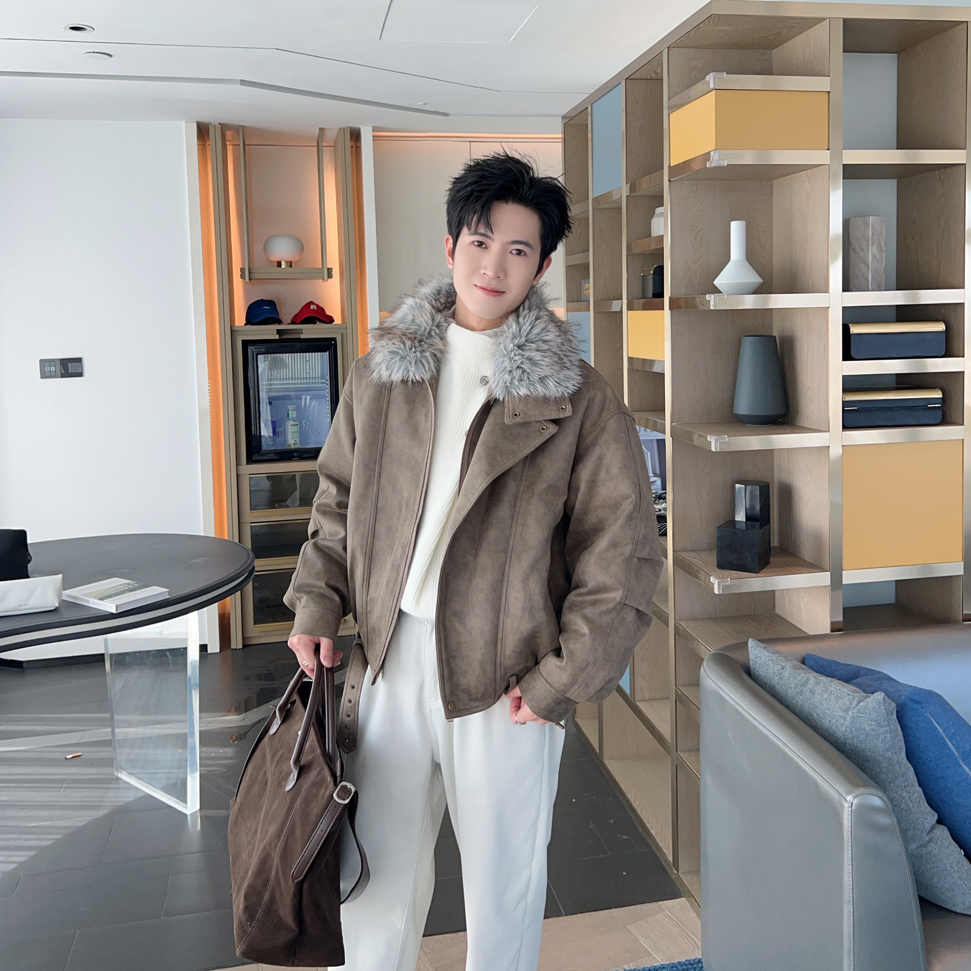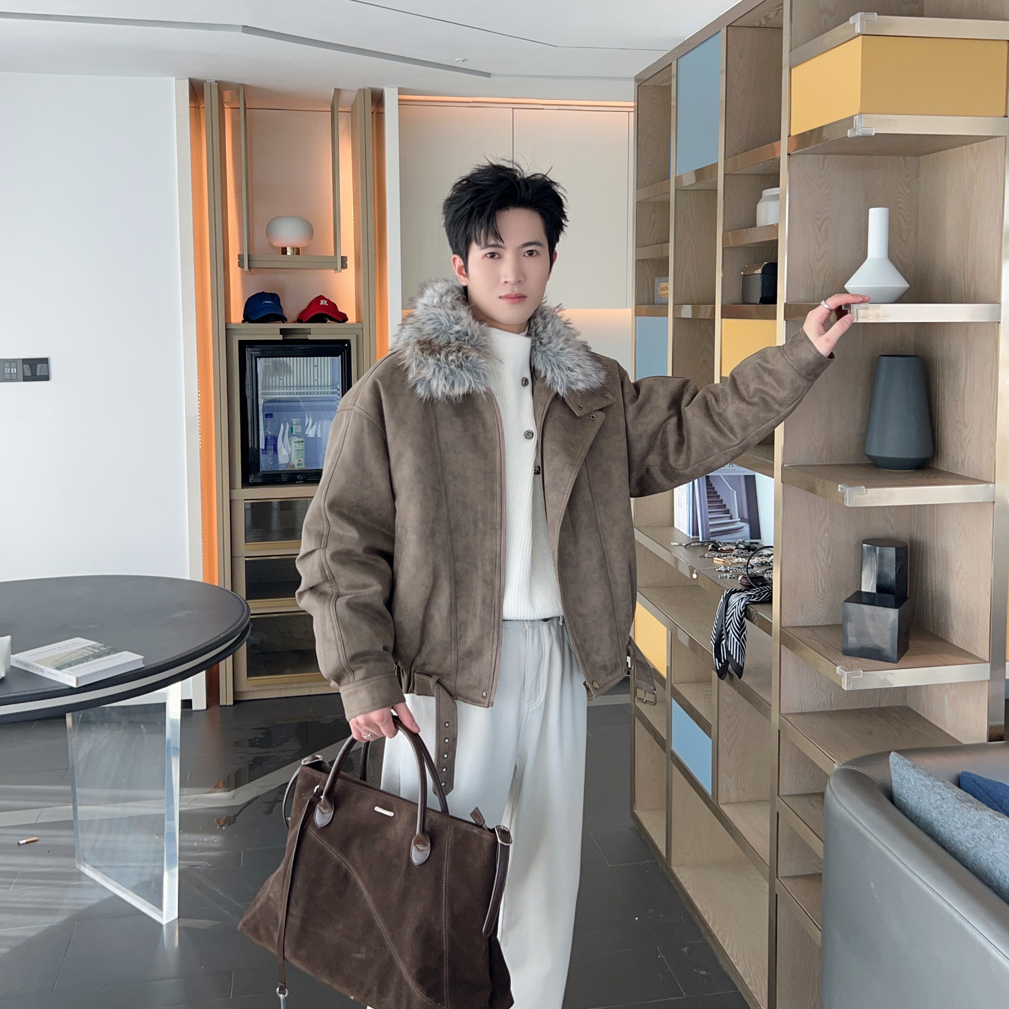 冬季时尚保暖座山雕毛领可拆卸内胆90白鸭绒羽绒服男款麂皮绒外套