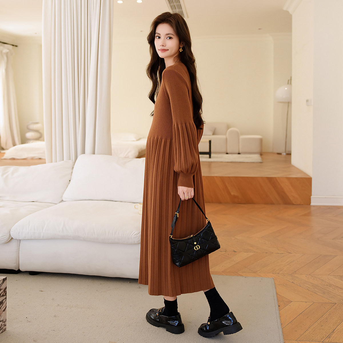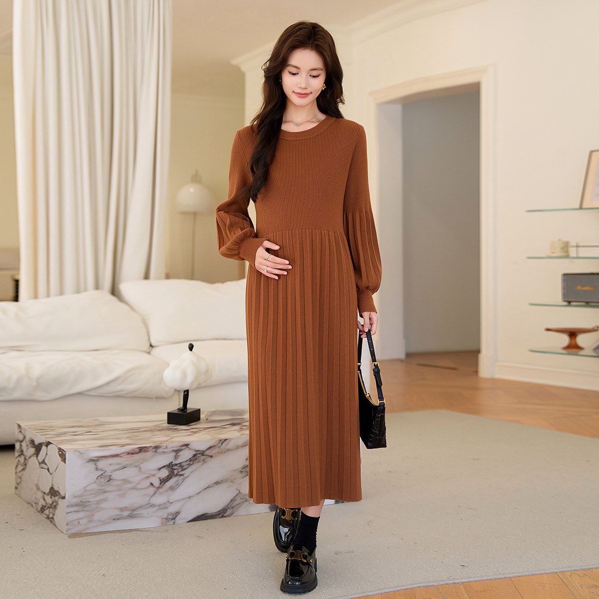 婧麒孕妇装连衣裙秋冬款女2025新款百褶裙复古时髦洋气高级感裙子