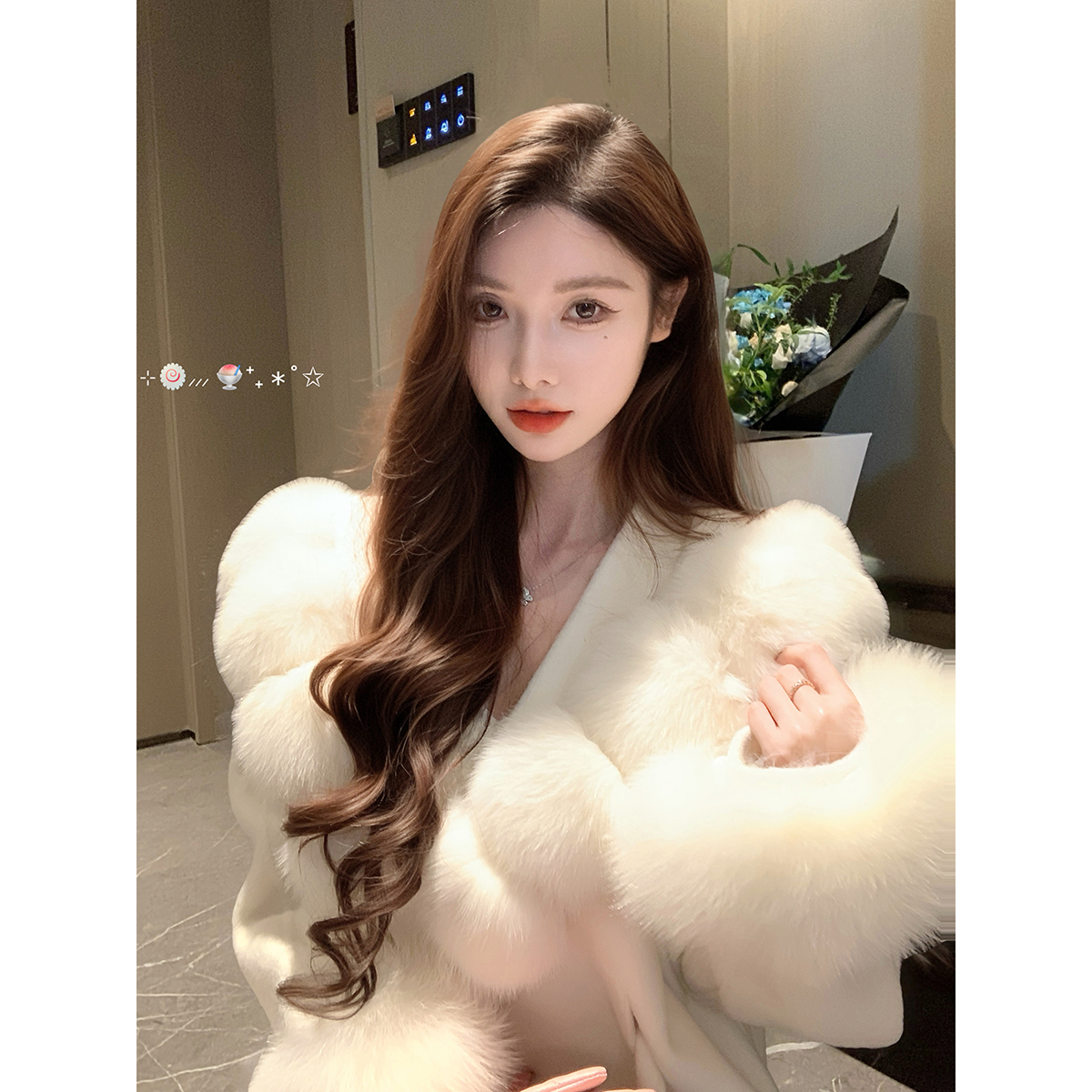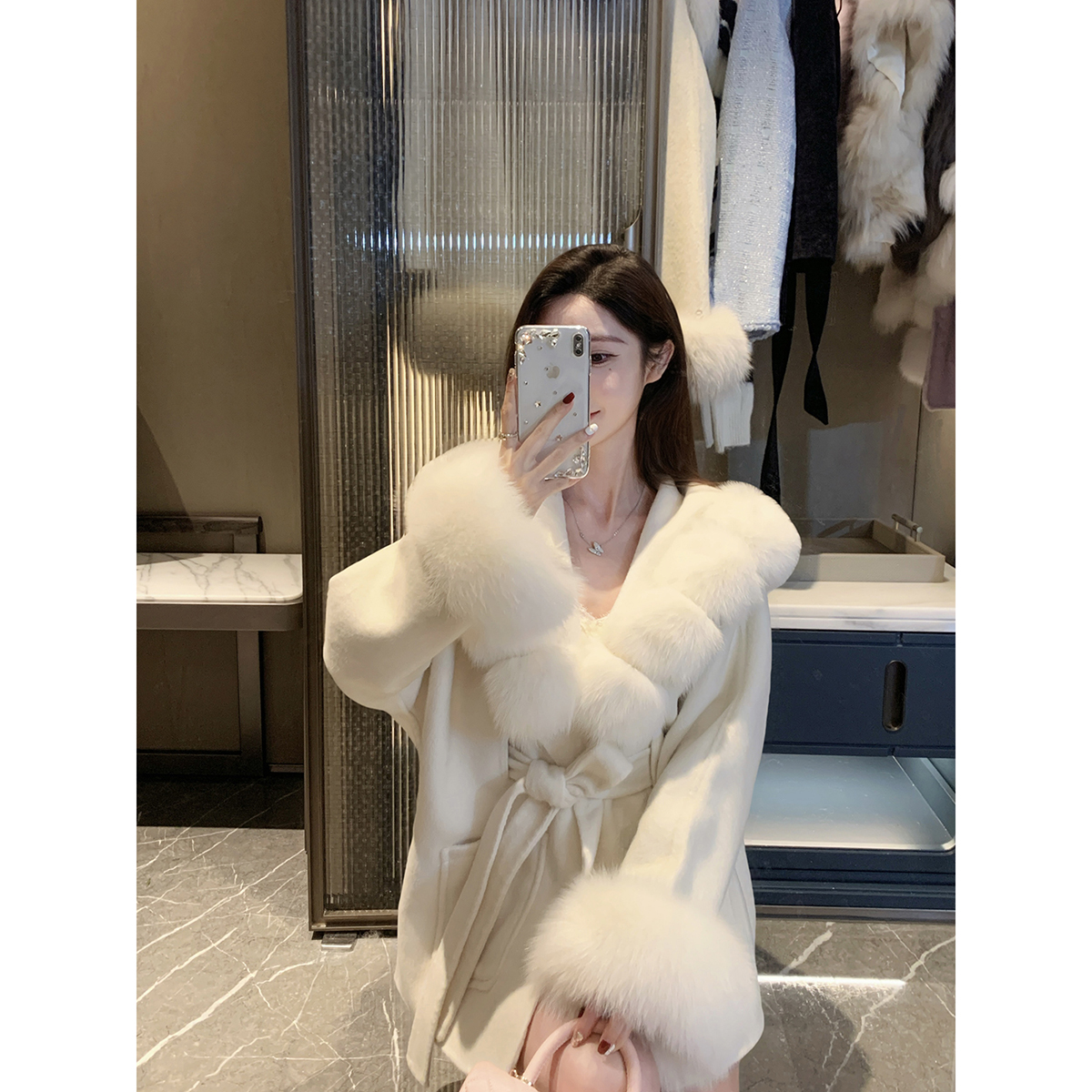 JustQin【精灵狐】2025秋冬新款澳毛狐狸大毛领双面呢大衣女外套