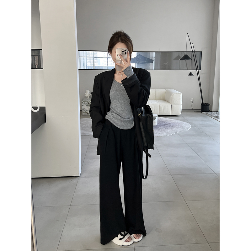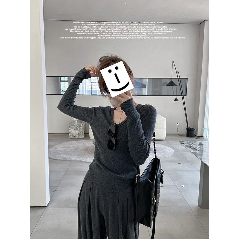 momo大姐姐新款黑色打底衫女设计感U领小上衣薄款针织衫显瘦长袖