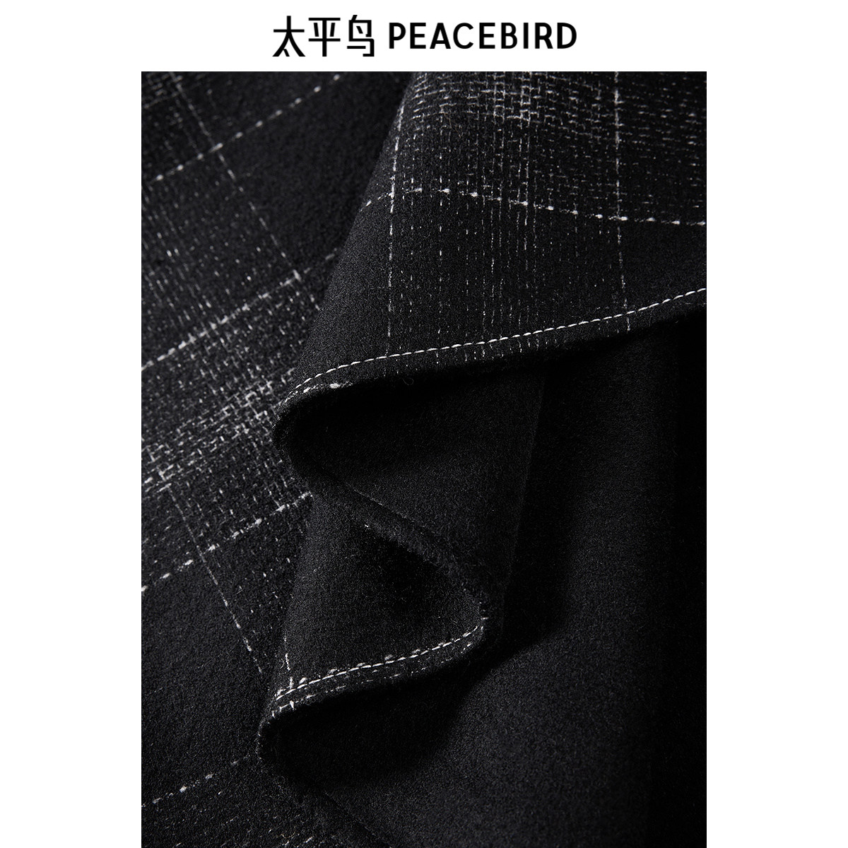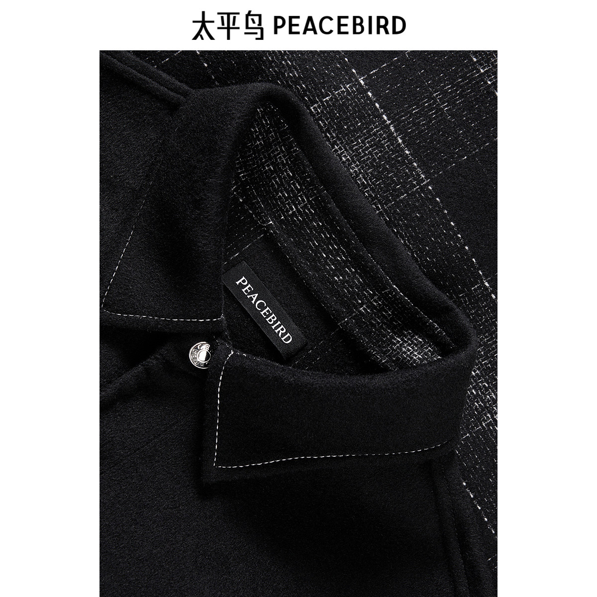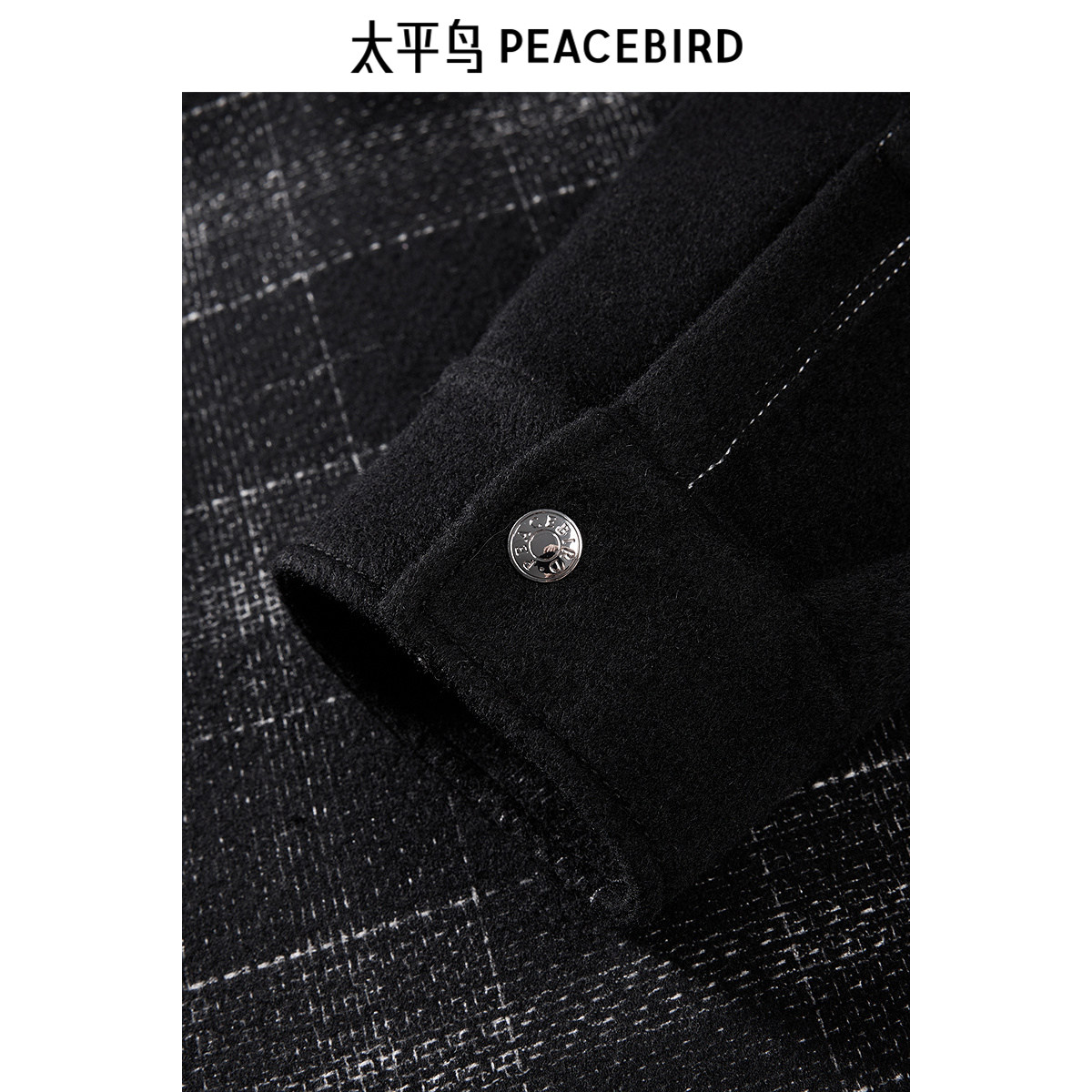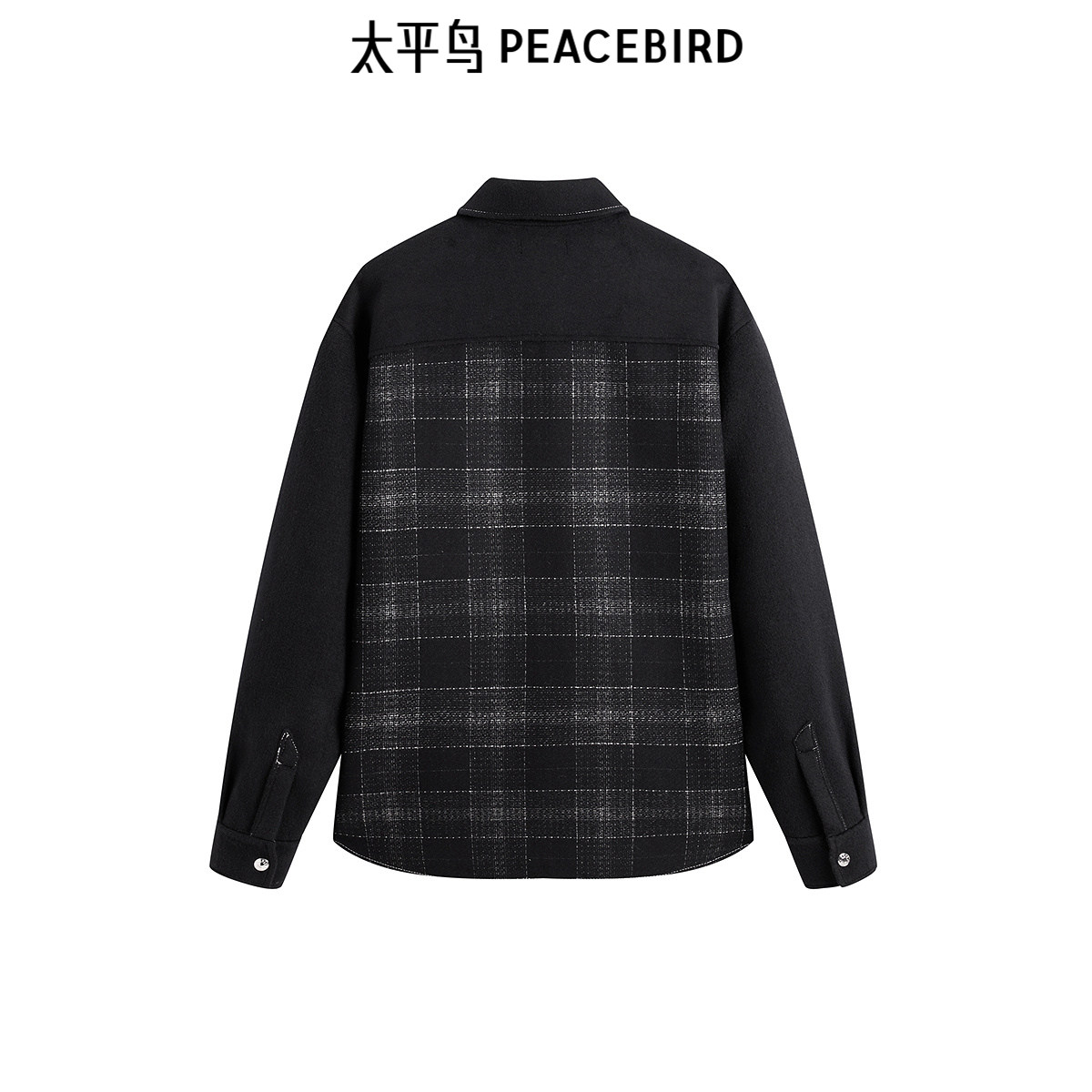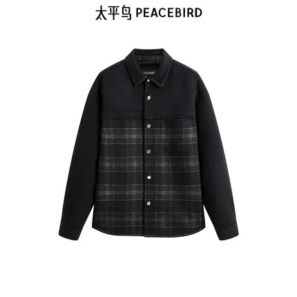 太平鸟男装 黑灰格纹衬衫男拼接小香风宽松绵羊毛外套潮衬衣男