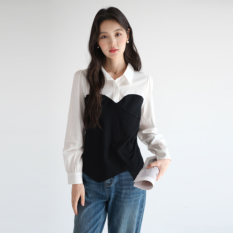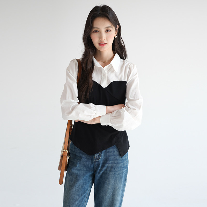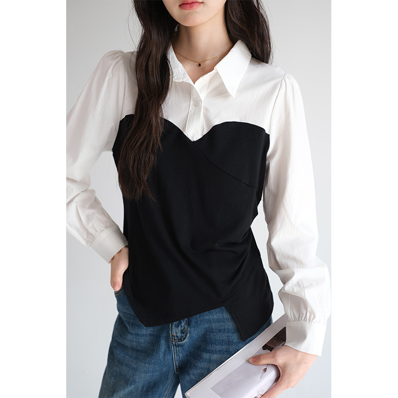 蓝若水假两件衬衫通勤Polo领上衣