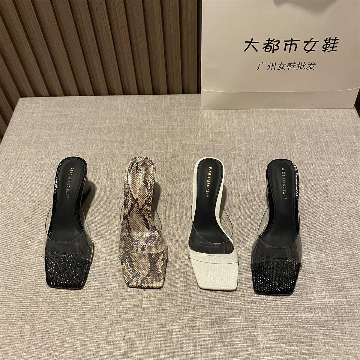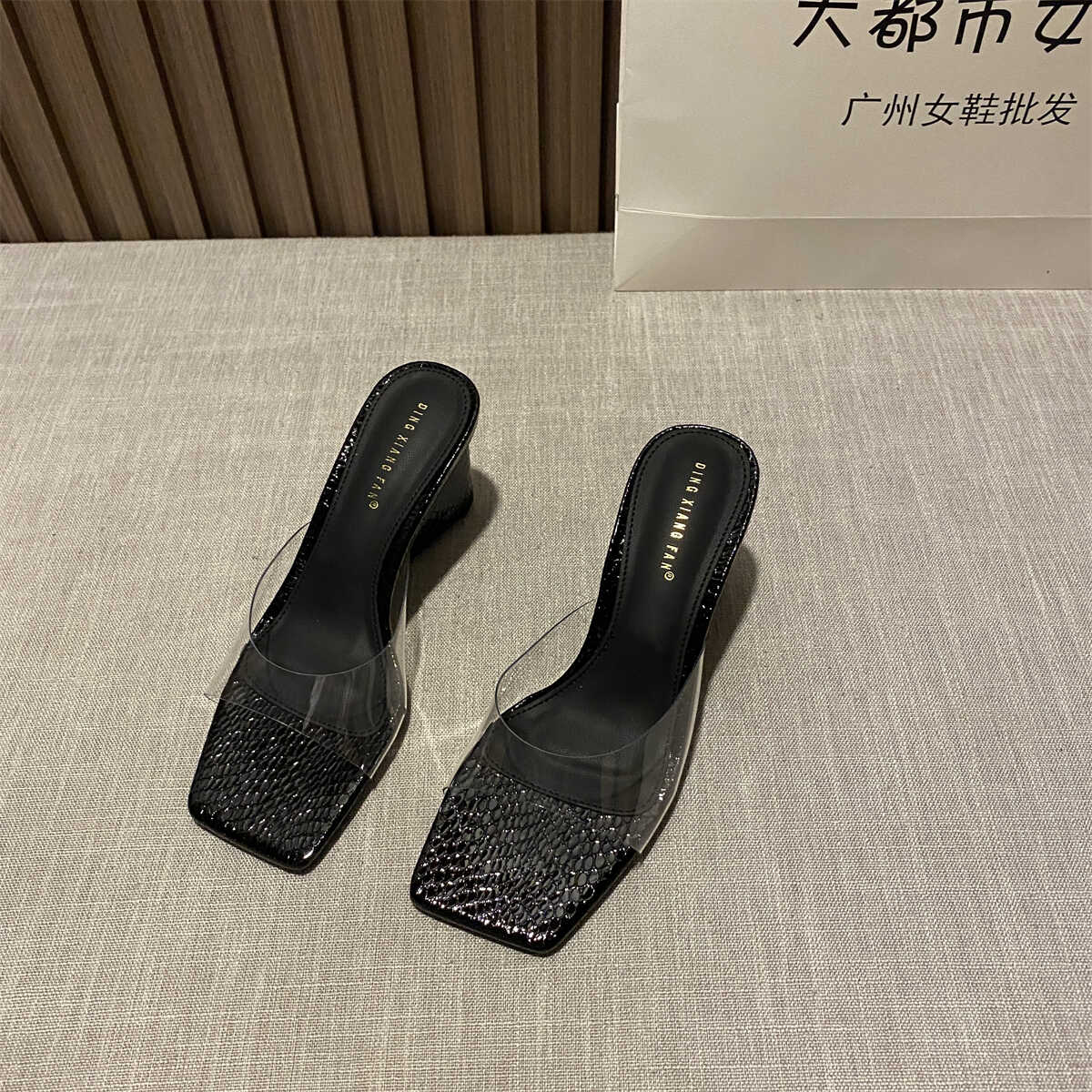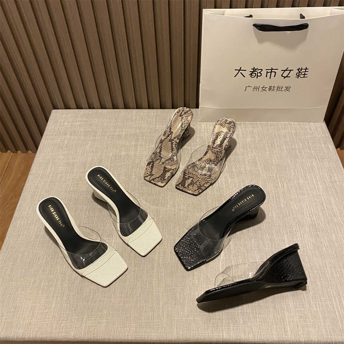 蛇纹鞋坡跟拖鞋女高跟鞋2024新款夏季凉拖鞋透明带欧美性感一字拖
