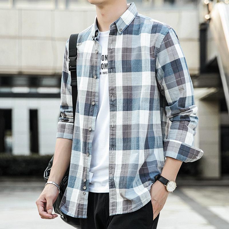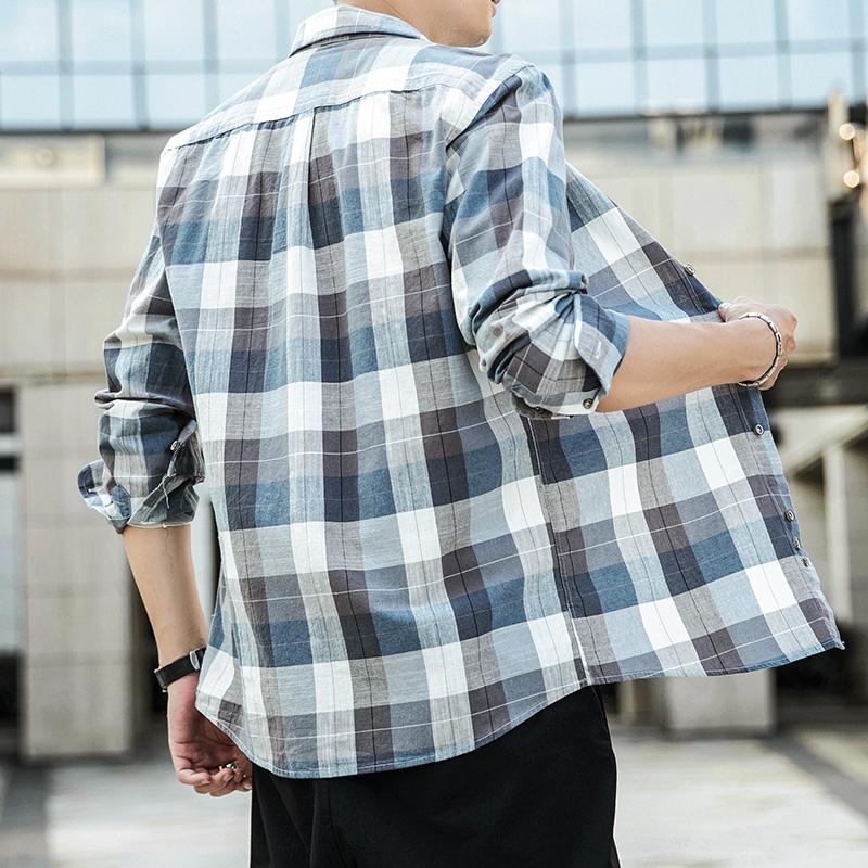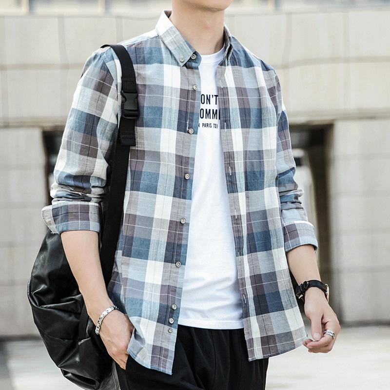 秋季新款男士纯棉长袖衬衫格子宽松休闲衬衣上衣青年男装外套衣服