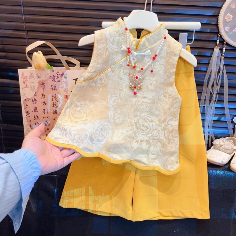 女童国风套装夏季2025新款儿童洋气中式背心马甲汉服阔腿裤两件套