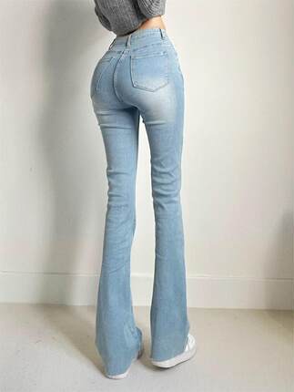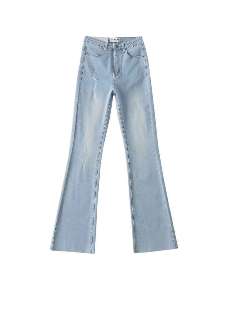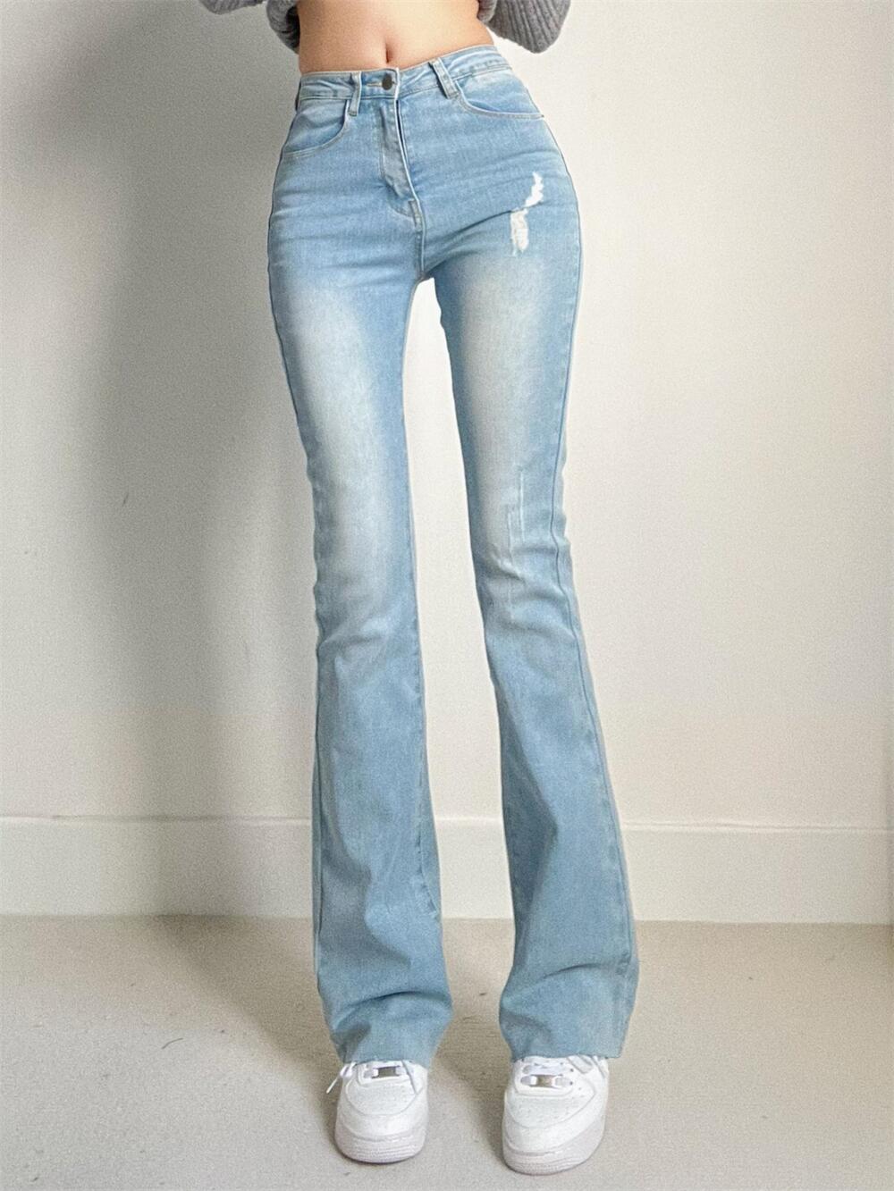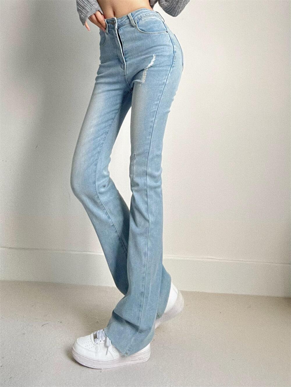 浅蓝色蜜桃臀高腰拖地牛仔长裤女水洗微喇叭裤显瘦修身翘臀直筒裤