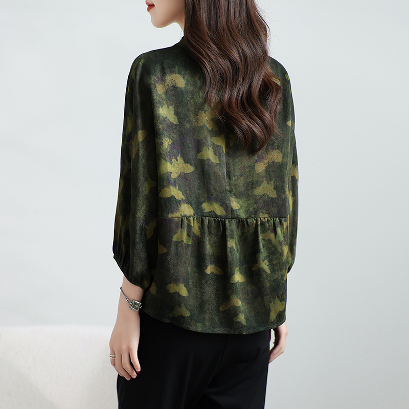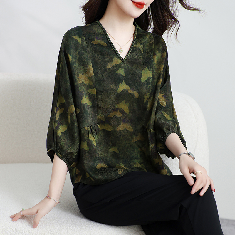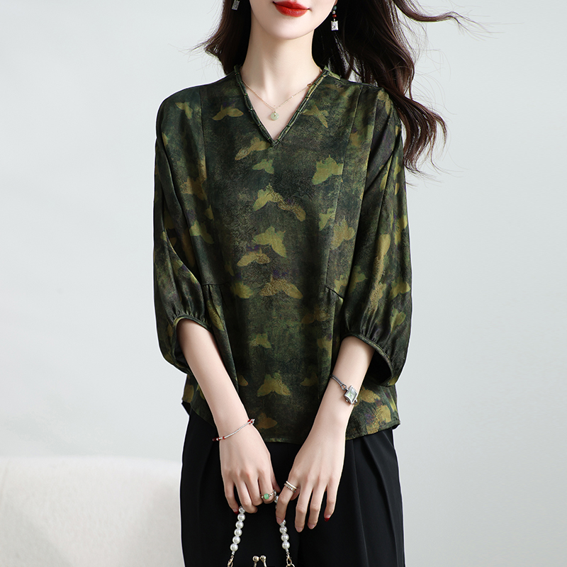 新款香云纱真丝上衣女休闲复古小衫莨纱桑蚕丝v领印花宽松T恤夏