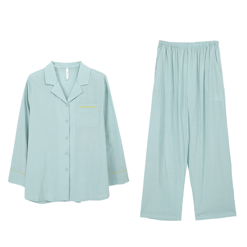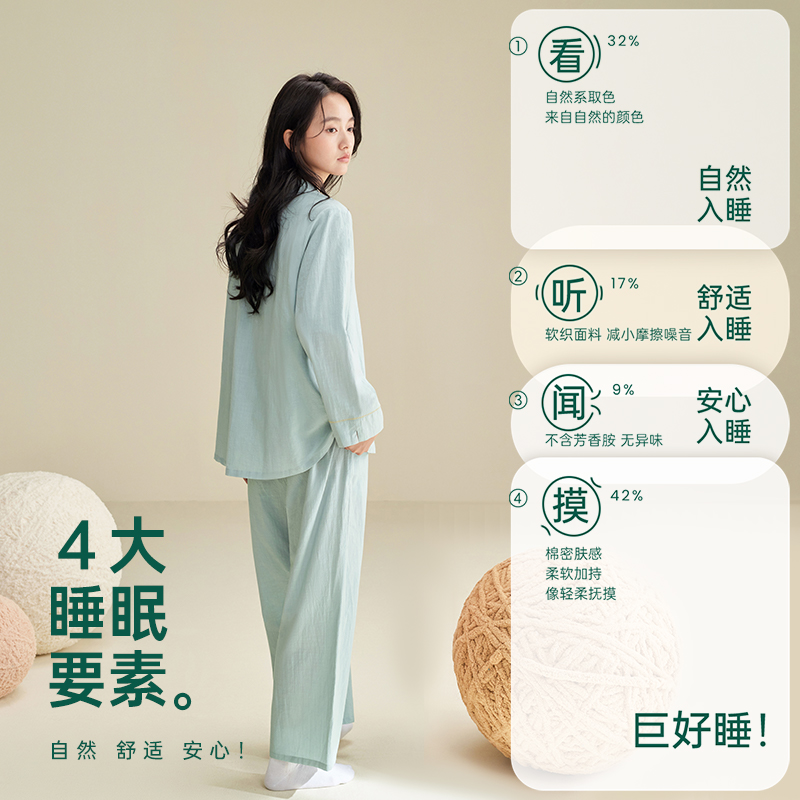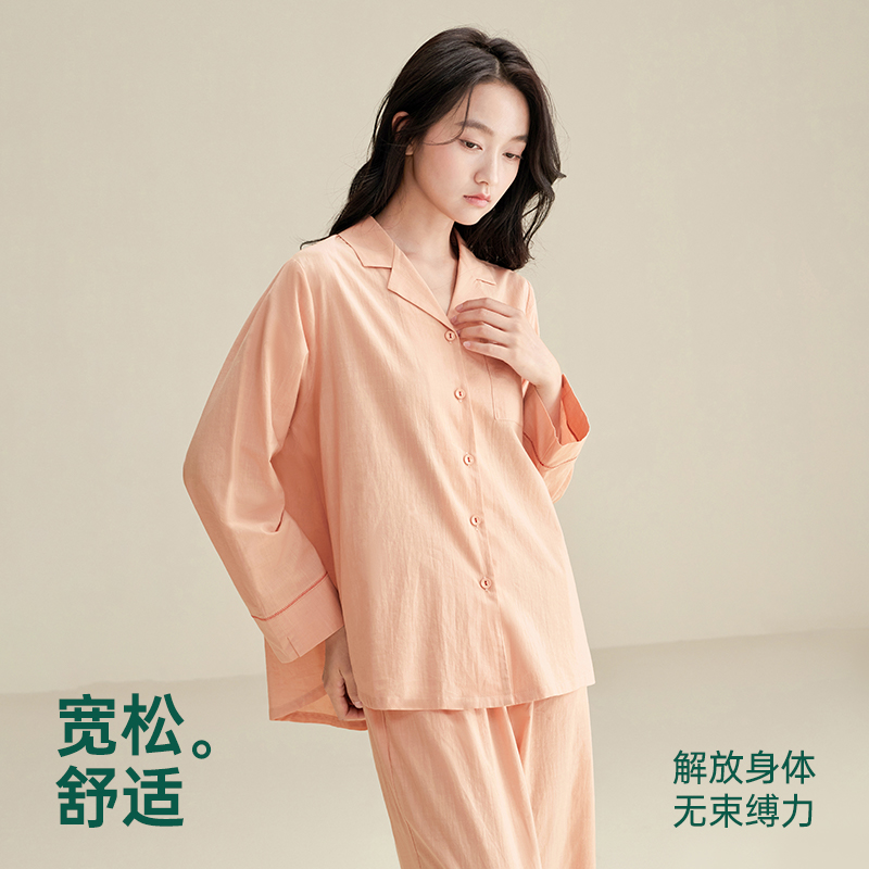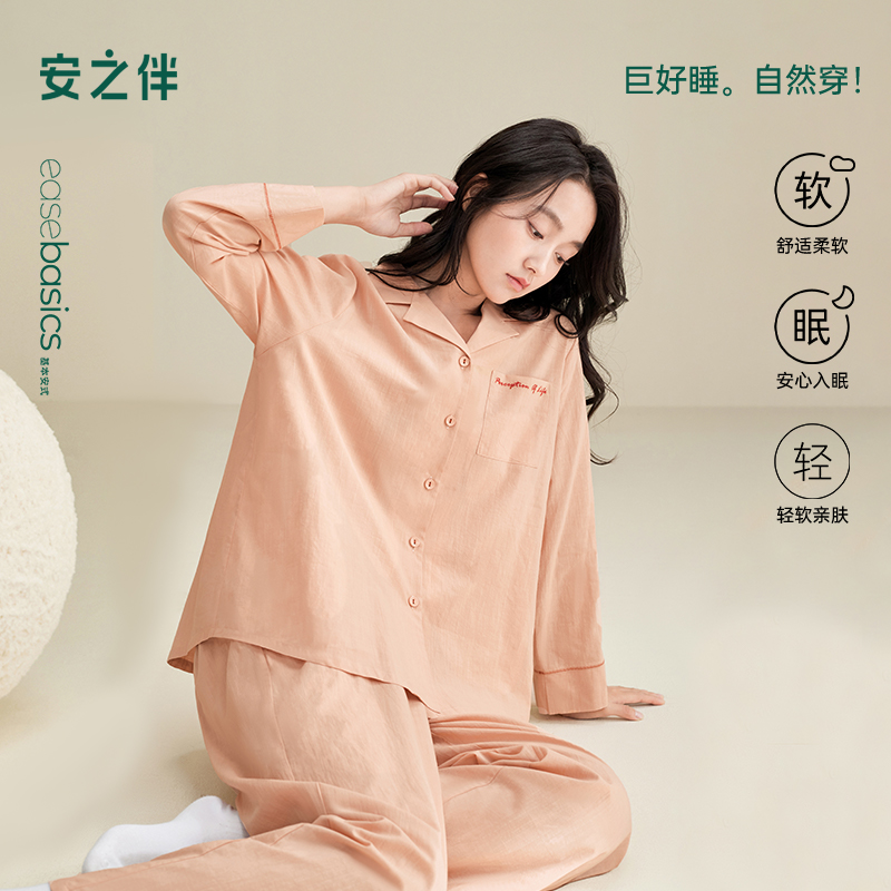 安之伴新款春秋睡衣女长袖开衫全棉宽松简约纯色高级感家居服套装