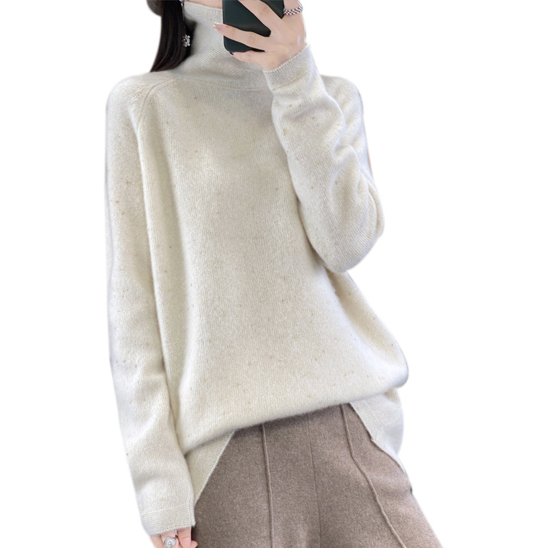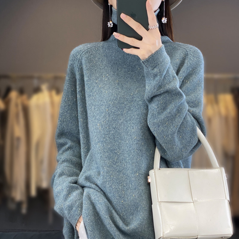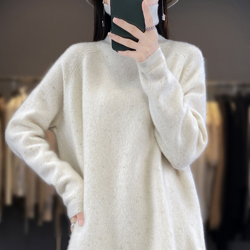 高领100%纯羊毛衫女秋冬宽松慵懒风毛衣中长款亮丝高端羊绒针织衫