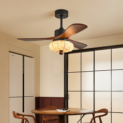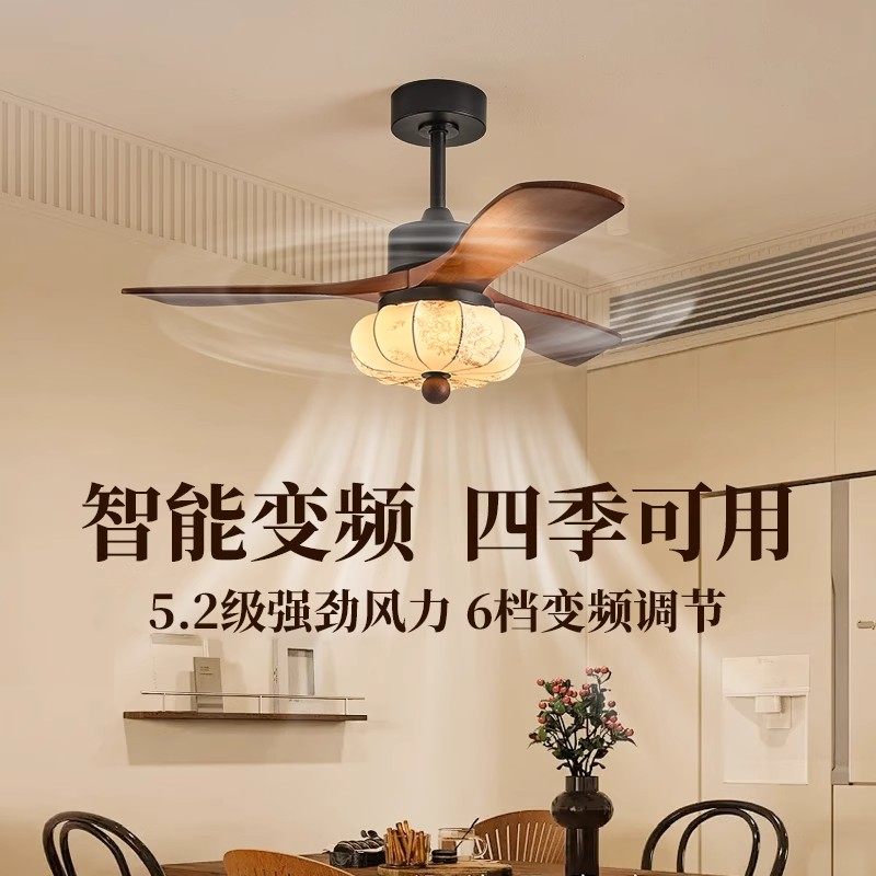 宋代美学风扇灯中古胡桃木布艺蚕丝客厅餐厅吊扇灯卧室房间书房灯