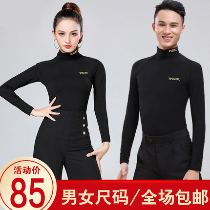 春秋拉丁舞上衣男女士交谊舞服长袖新款黑色翻领摩登舞专业练功服