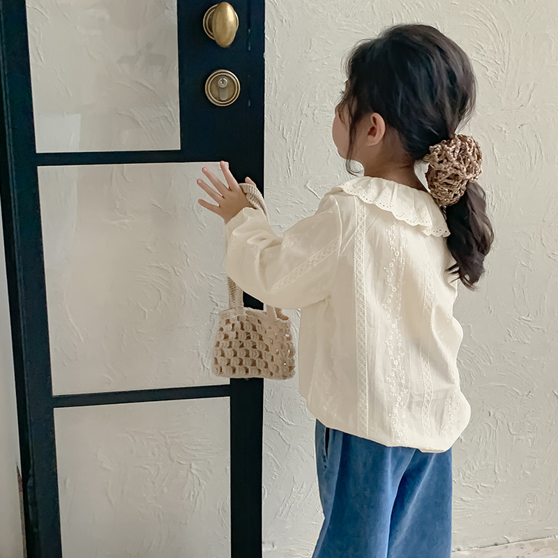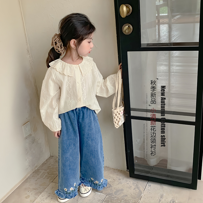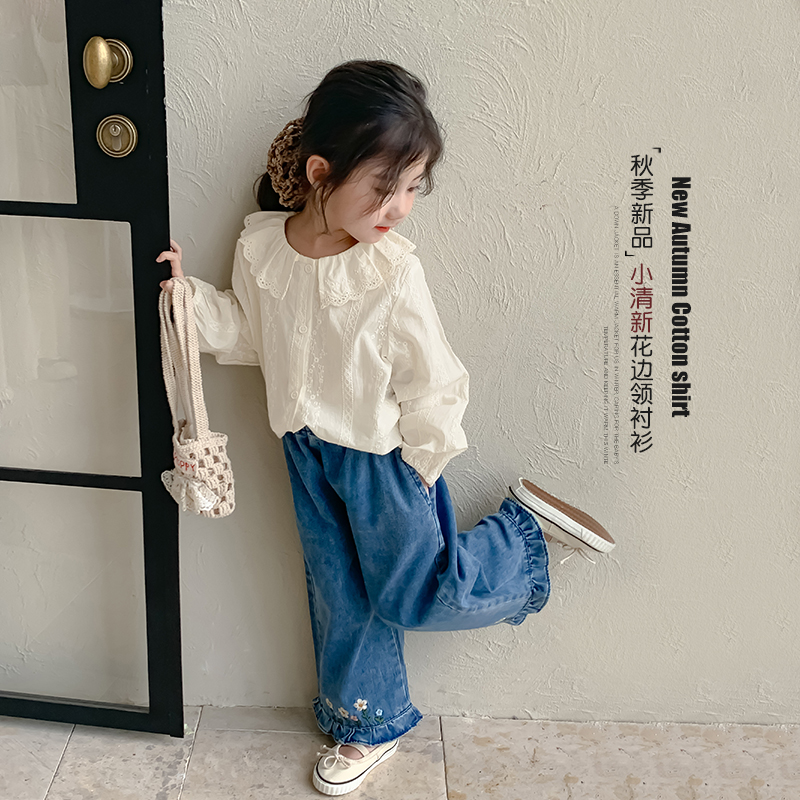 女童衬衫秋装2025新款女孩蕾丝花边荷叶领衬衣儿童翻领公主娃娃衫