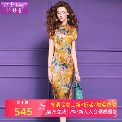 菲梦伊100桑蚕丝印花连衣裙女夏装新中式国风高端真丝贵妇旗袍裙