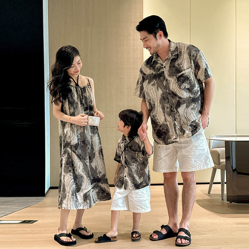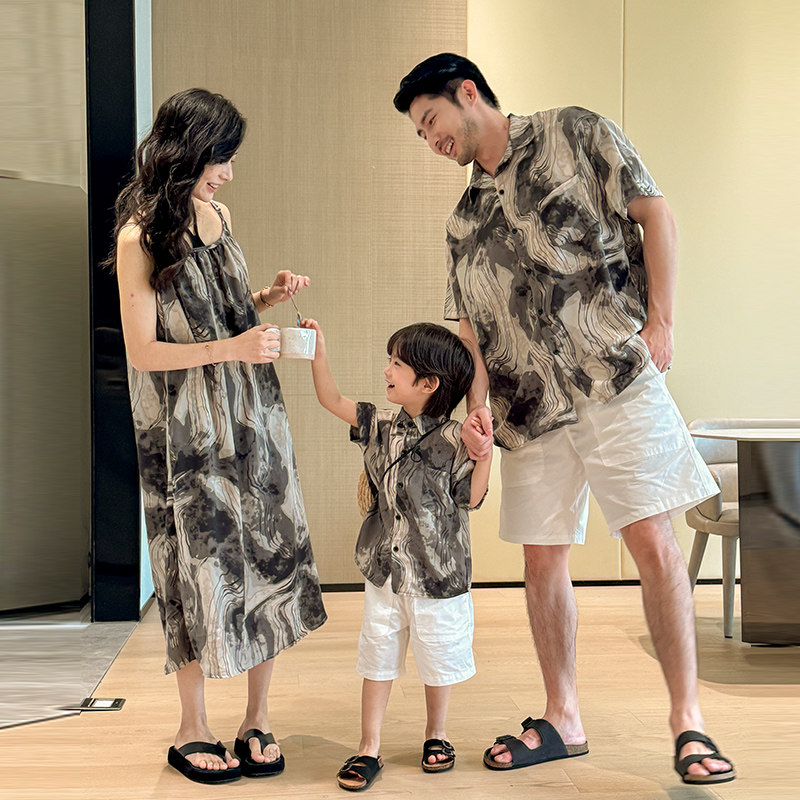 亲子装一家三口夏季新款沙滩母女吊带连衣裙海边度假母子休闲衬衫