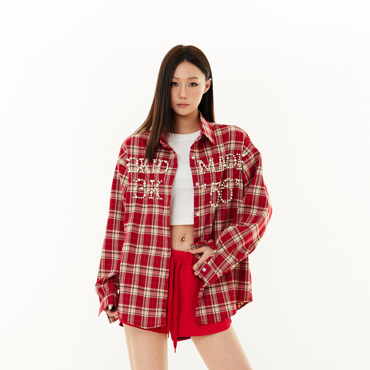 SREK美式复古钉珠设计格子长袖衬衫男女夏季设计感痞帅风衬衣外套