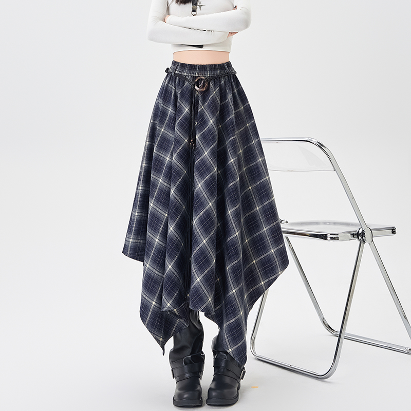 不规则半身裙美拉德法式格纹女秋季复古垂感高腰遮胯a字大摆伞裙