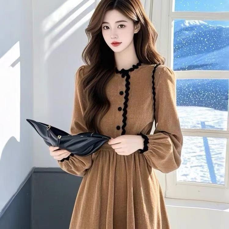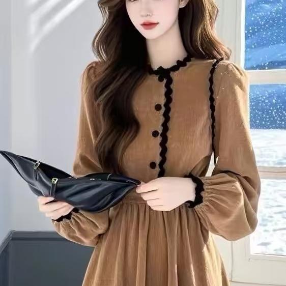 2025春秋冬新款法式冷淡系独特别致卡其色灯芯绒连衣裙女收腰显瘦