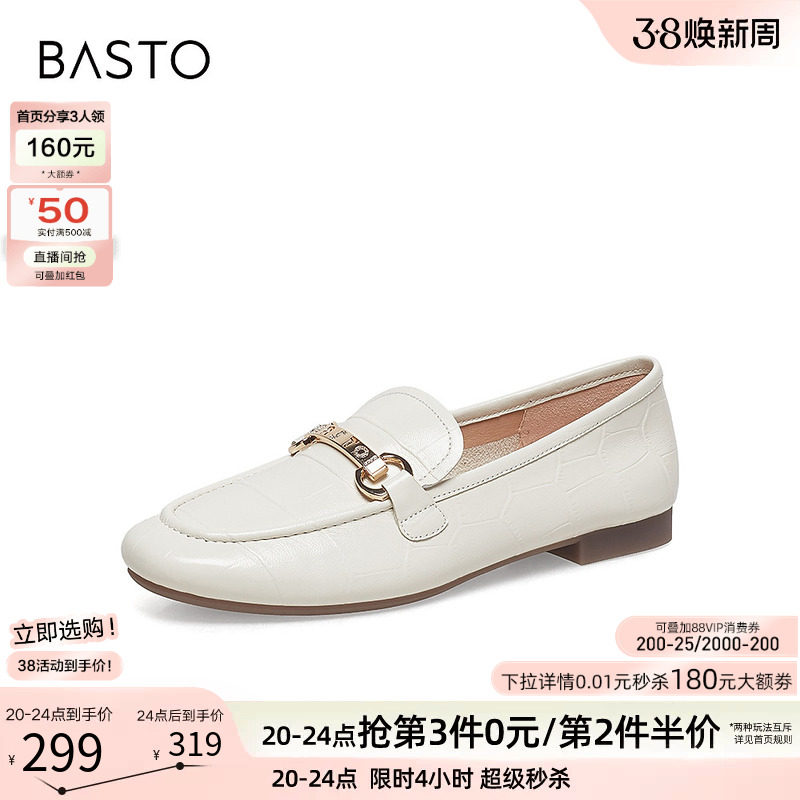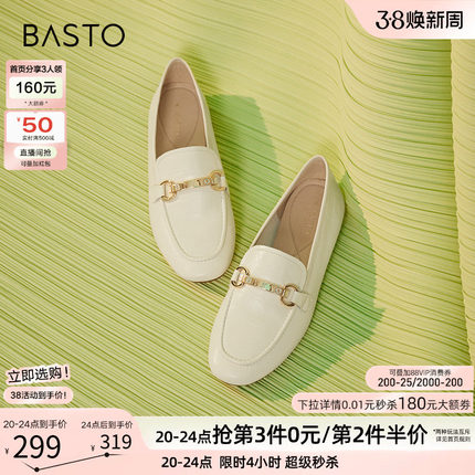 百思图春季商场新款通勤低跟白色羊皮乐福鞋小皮鞋女单鞋WEF61AA5