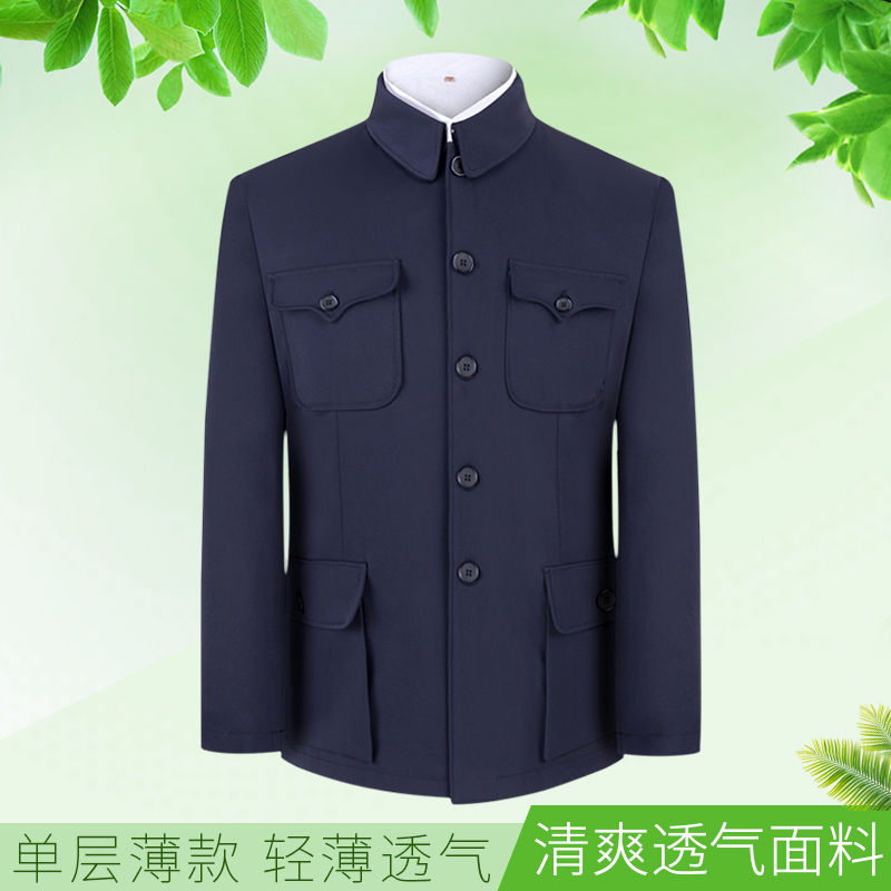 单层薄款中山装男套装无内里老式中山服爷爷装中老年人衣服爸爸装