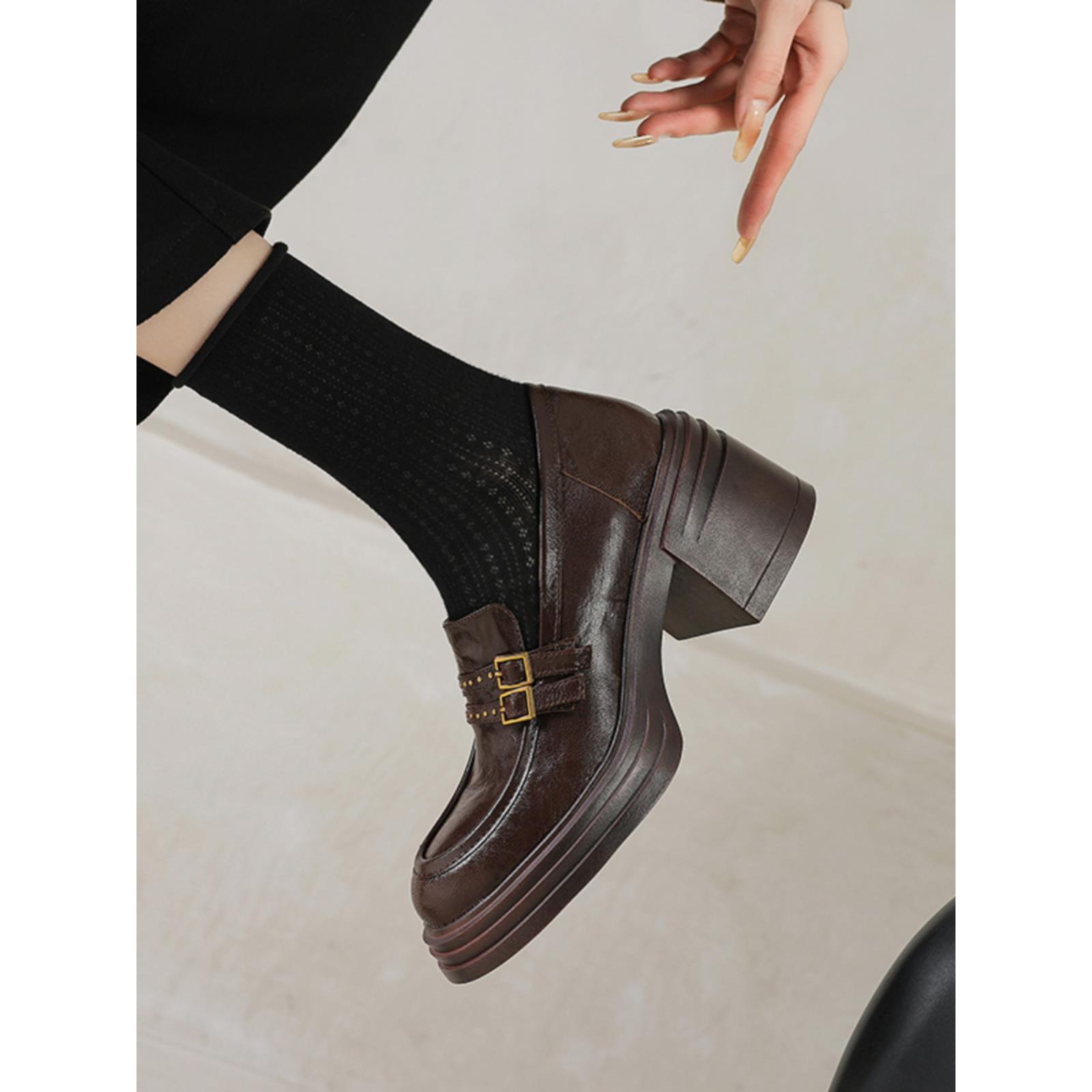 英伦风复古羊皮扣带粗跟高跟乐福鞋女百搭圆头铆钉单鞋厚底小皮鞋