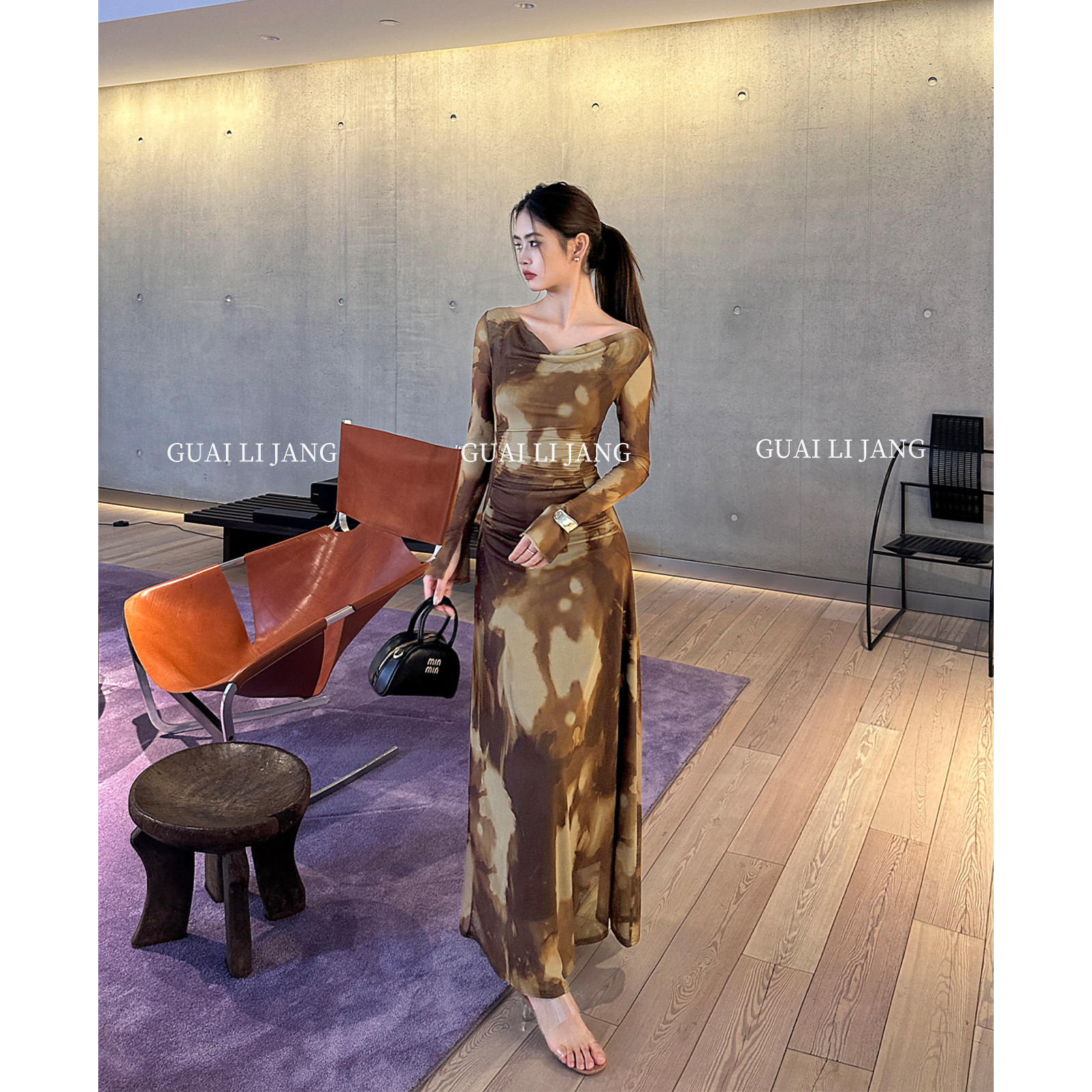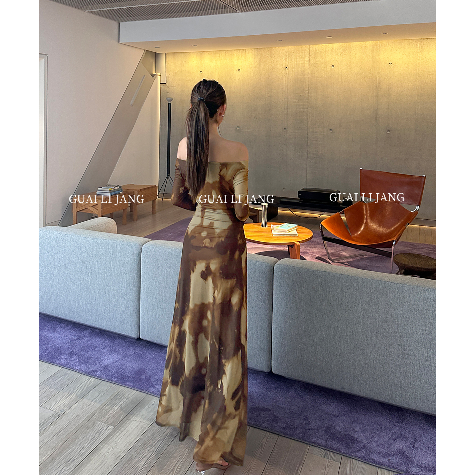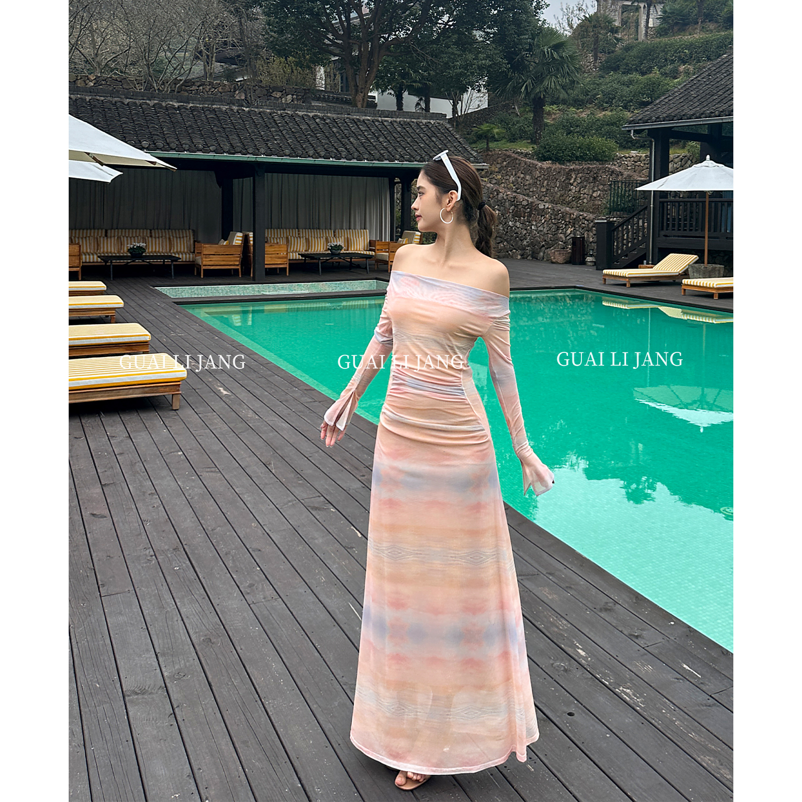 一字肩印花网纱连衣裙女春秋设计感修身显瘦露肩沙滩度假包臀长裙