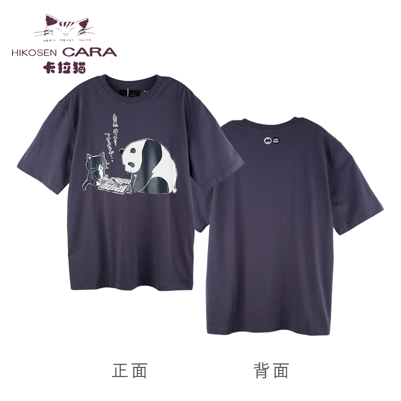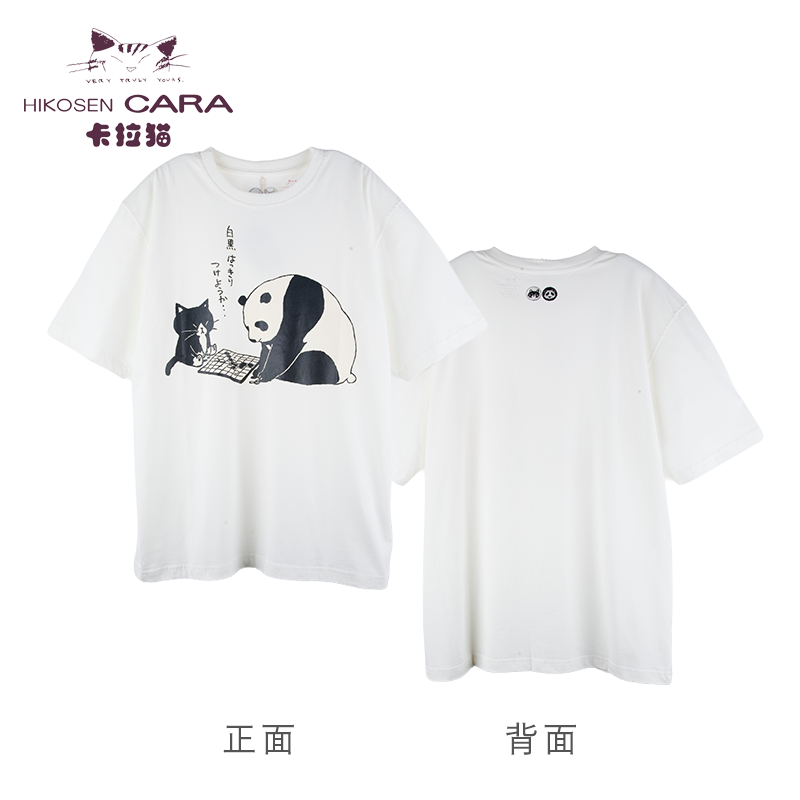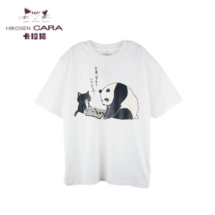 HIKOSEN CARA熊猫与猫猫短袖T恤可爱猫咪日本潮牌女纯棉宽松上衣