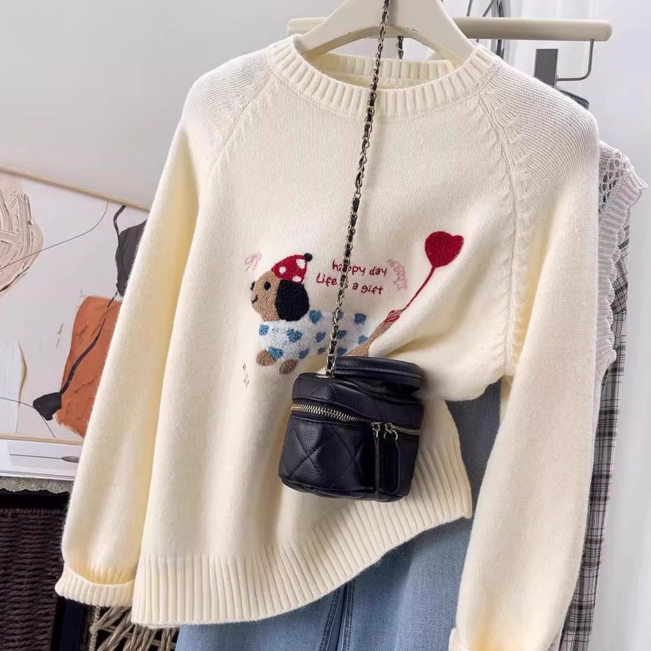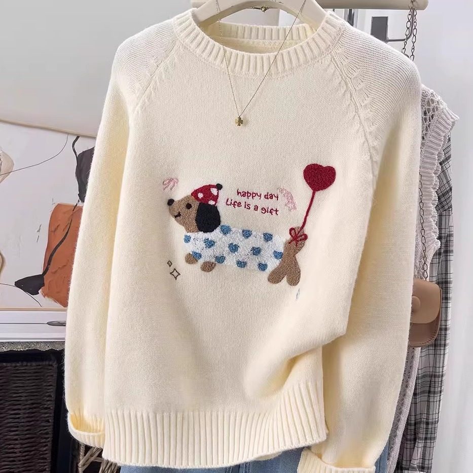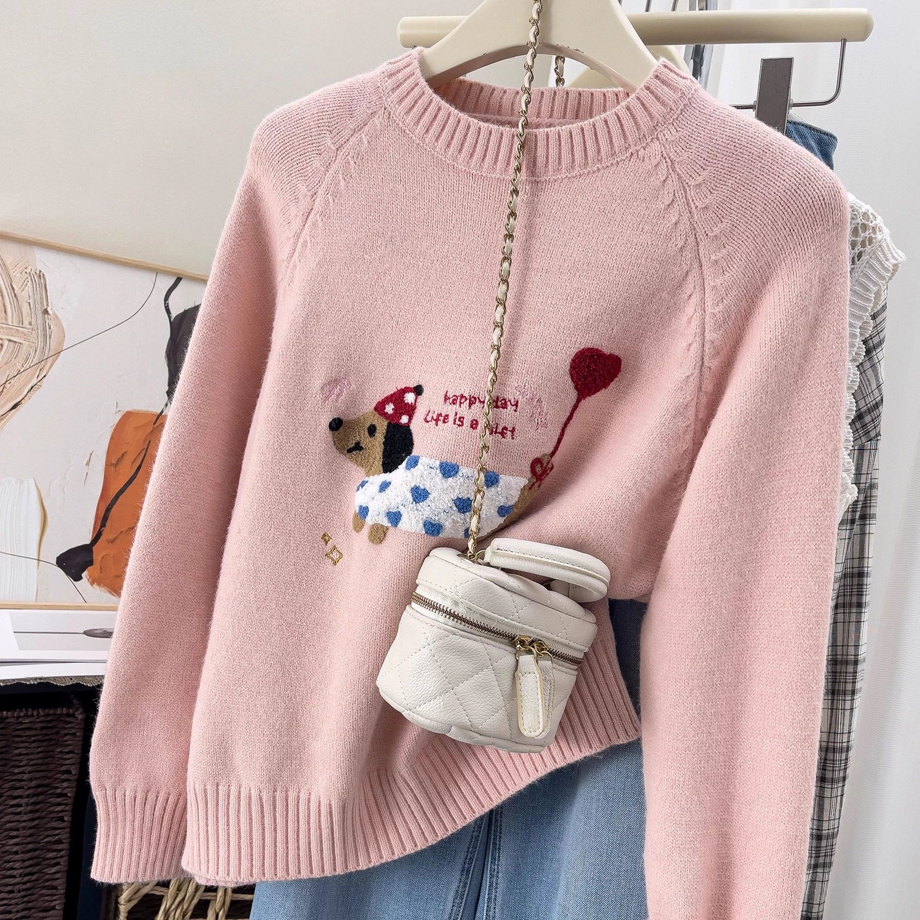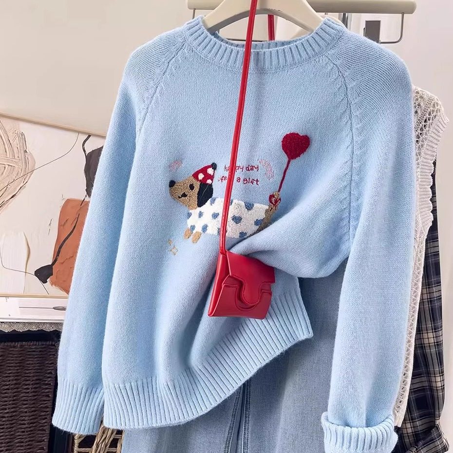 可爱风小狗刺绣针织衫女秋冬季外穿蓝色圆领宽松遮肚毛衣大码上衣